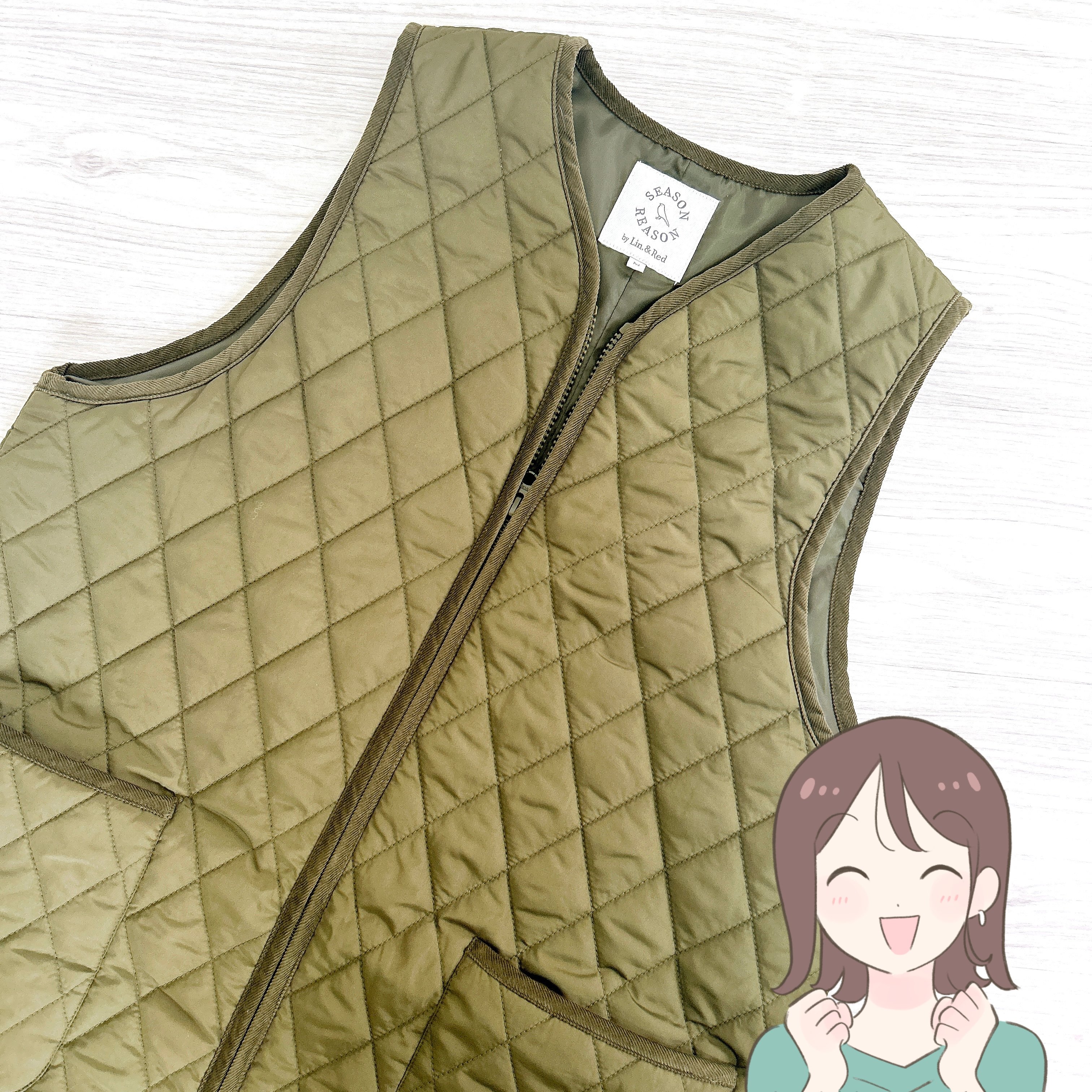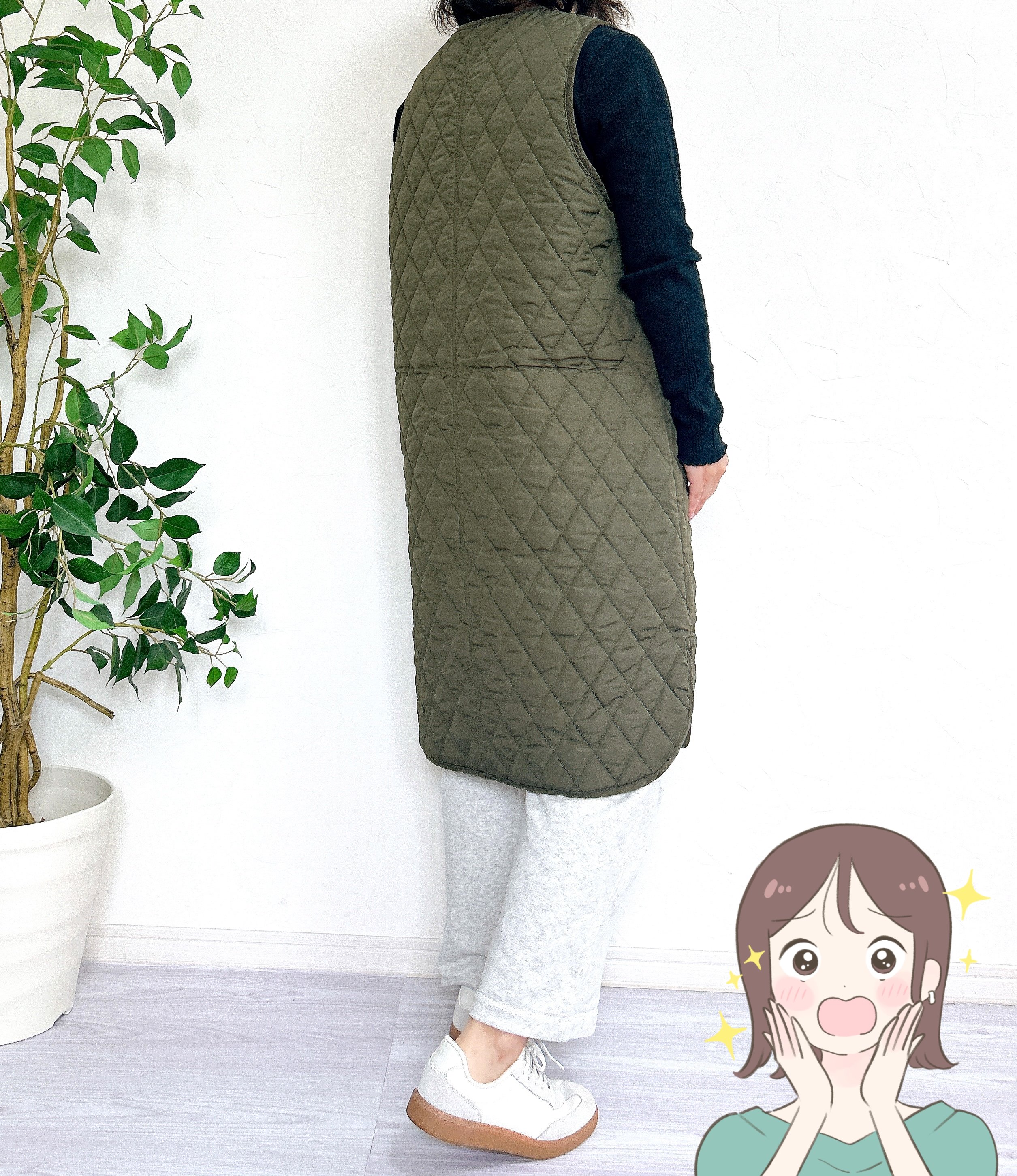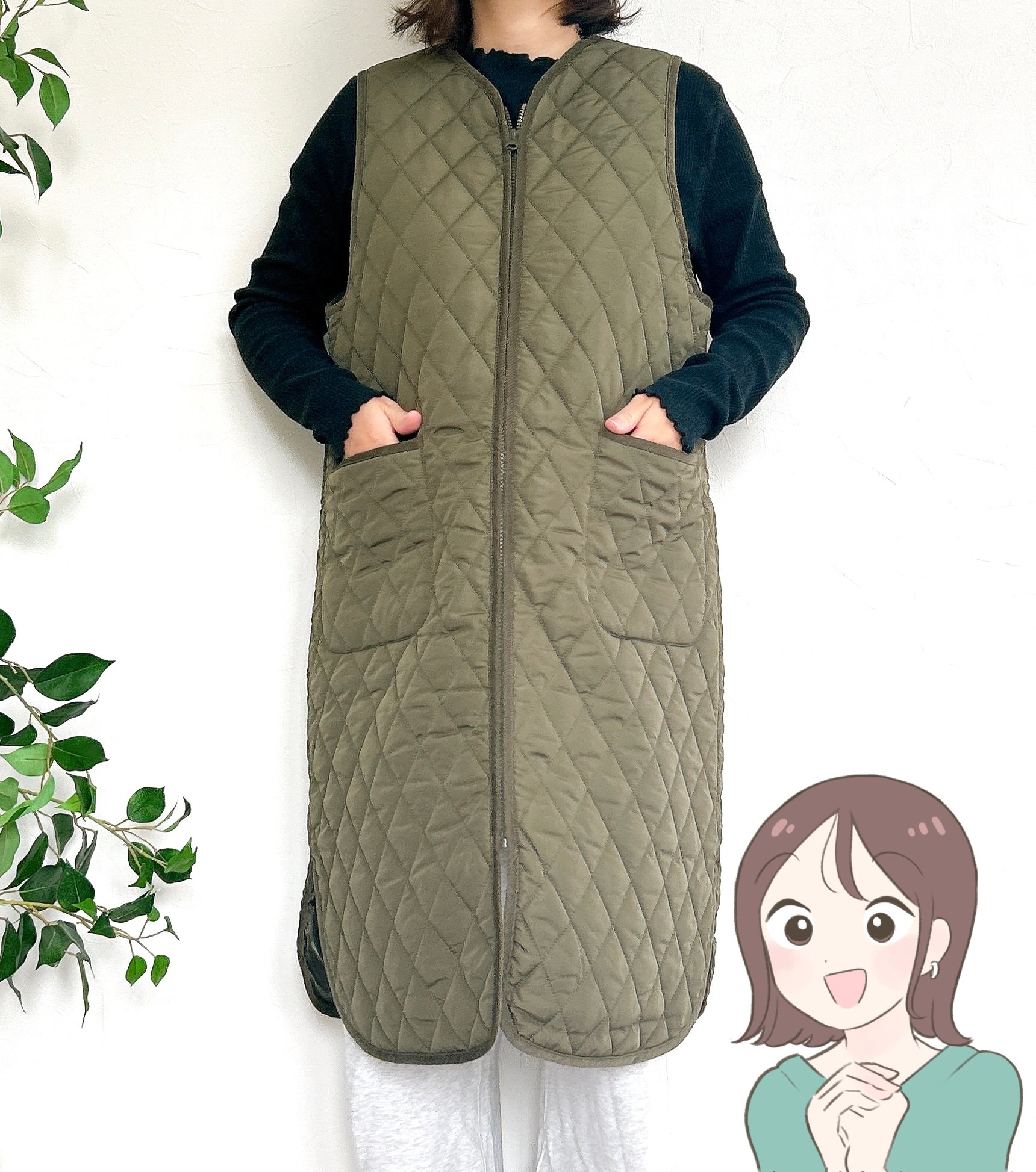 ダイヤのような形のキルティングがかわいらしい、ファスナー式のロングベストです。カラーはカーキとブラックの2色あり、今回はカジュアルな色合いのカーキを選びました。