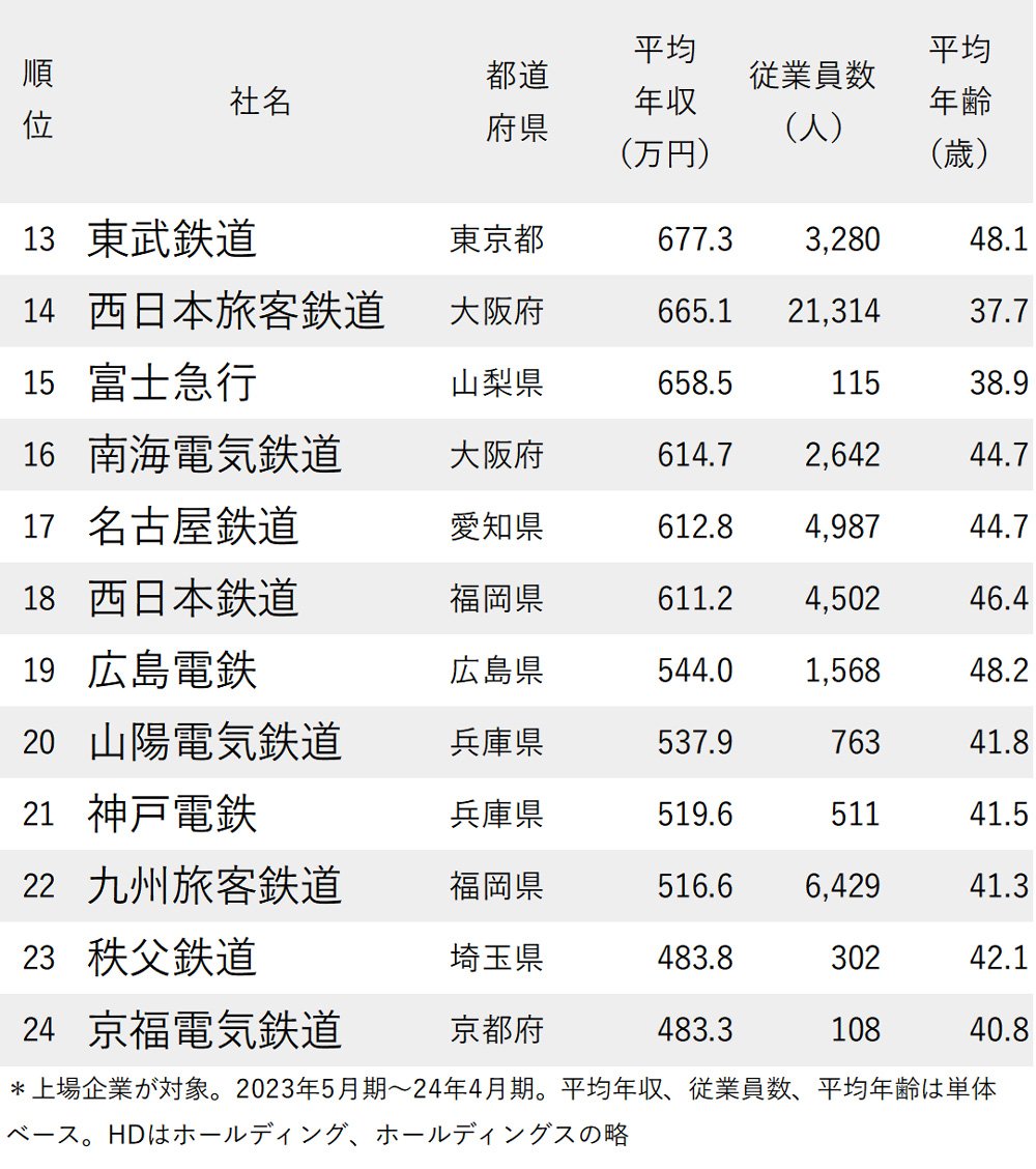 年収が高い鉄道会社ランキング2024【24社完全版】JR西日本が14位、JR東日本と東海は? ダイヤモンド・ライフ編集部 松本裕樹: 記者 マネー・投資ニッポンなんでもランキング! 2025年10月27日 6:00 記事をクリップ URLをコピー 記事を印刷 Xでシェア Facebookでシェア はてなブックマークでシェア LINEでシェア noteでシェア 拡大画像表示 1 2 3 4 記事をクリップ URLをコピー 記事を印刷 Xでシェア Facebookでシェア はてなブックマークでシェア LINEでシェア noteでシェア 有料会員限定機能です詳細はこちら おすすめの会員限定記事 「定年後の働き方」を決める前に絶対にやるべき“たった1つのこと”とは?【社労士が解説】 エコノミークラスでも大丈夫!「空港ラウンジ」を使い倒す4つの裏技〈再配信〉 関連記事 年収が高い陸運・海運会社ランキング2024【完全版】1位は年収1600万円超え、JR東日本・東急は何位? ダイヤモンド・ライフ編集部,宝金奏恵 年収が高い外食企業ランキング2024【96社完全版】スシロー・くら寿司・はま寿司の年収序列は? ダイヤモンド・ライフ編集部 年収が高い商社・卸売企業ランキング2024【201社完全版】伊藤忠や丸紅は何位? ダイヤモンド・ライフ編集部,吉岡綾乃 年収が高い広告会社ランキング2024〈49社完全版〉電通でも博報堂でもない「意外な2位」は? ダイヤモンド・ライフ編集部 特集 あなたにおすすめ