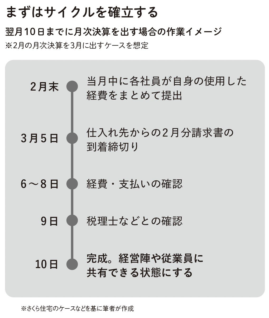 月次決算の内容についてはさくら住宅と同じく、最初は会計ソフトから簡単に出力できる財務会計ベースのものでいい。それだけで月次のP/L、B/S、C/Fを得られる。複数の事業が絡み合っていたり、資金繰りが逼迫していたりしなければ、これで十分な精度がある。