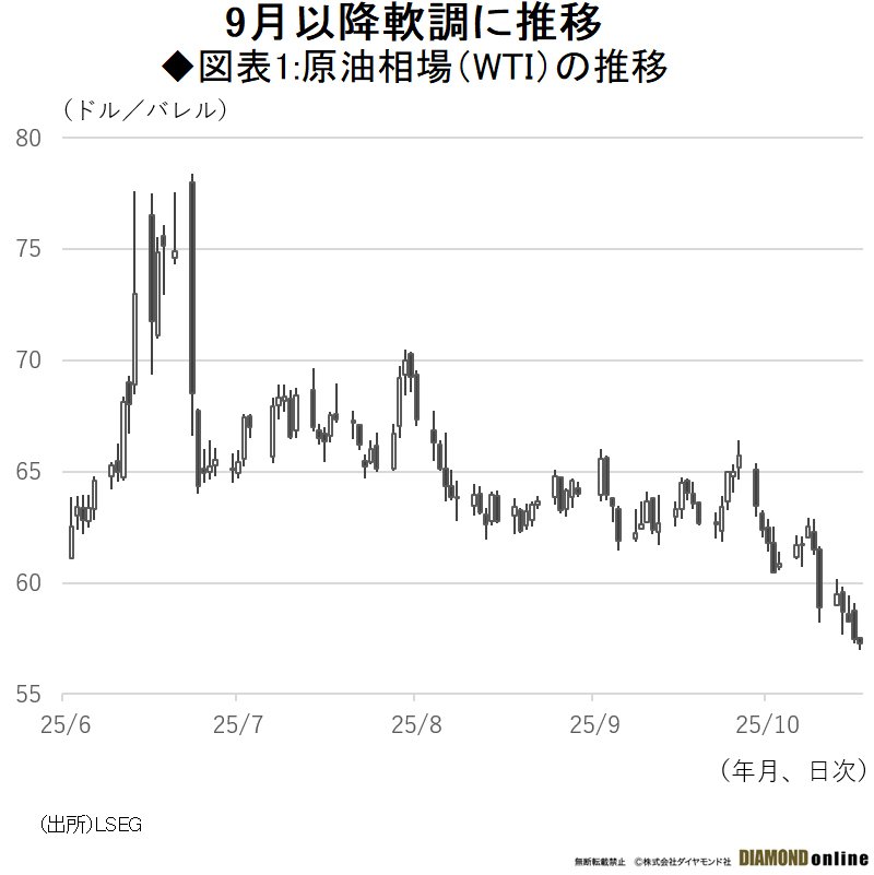 地政学リスク要因や米国と各国との通商交渉などを材料に一進一退が続いていた原油相場は、10月に入って下落傾向が強まり、1バレル60ドルを割り込んだ。