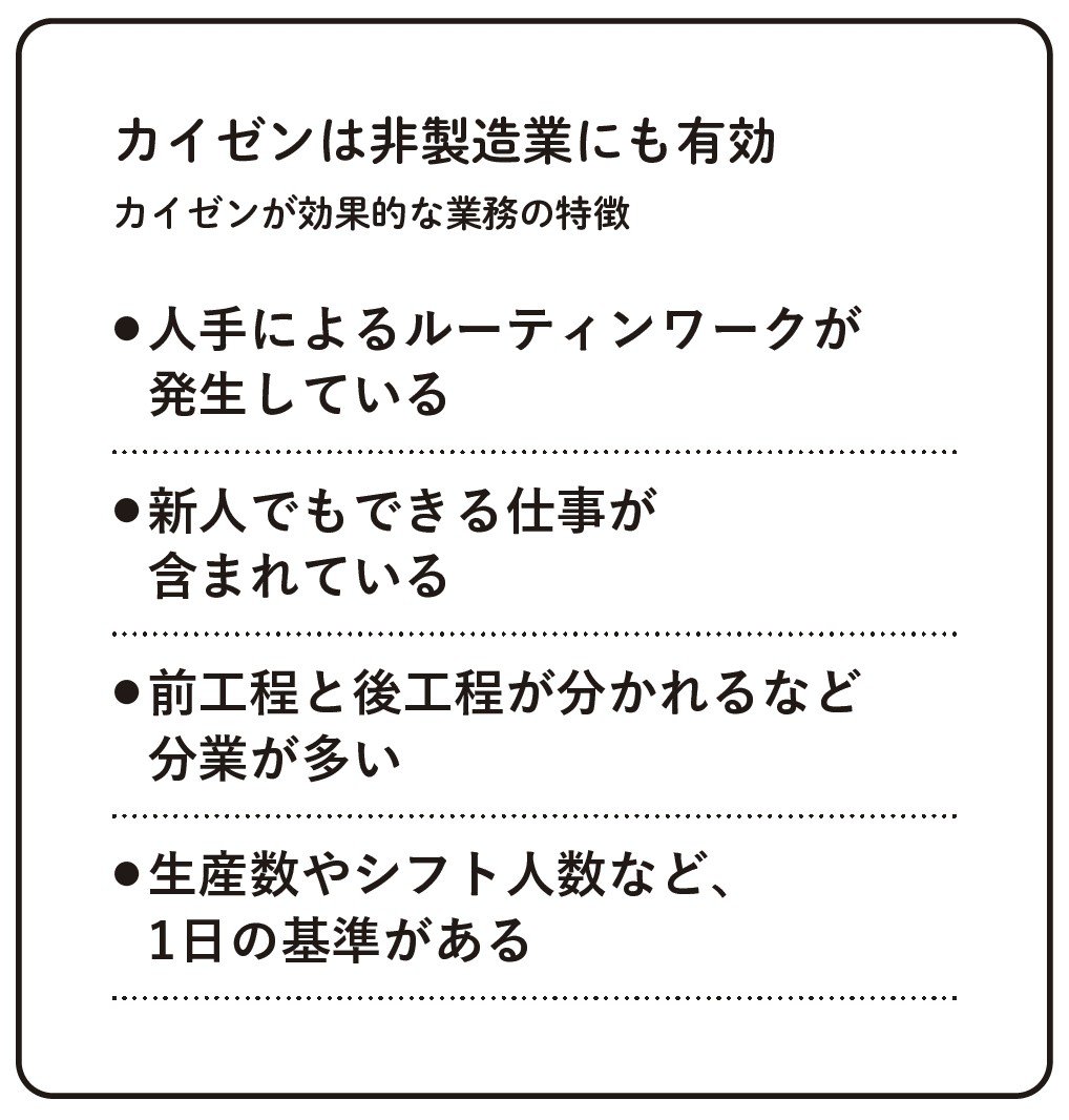 効率のよい方法をマニュアル化して周知し、ときには習熟度を測る研修などをすることで、如実に成果が上がる。これらは、「日・週・月単位で必ずやらなければいけないこと」なので、工場での作業のように、「何をすればいいか」「どうすると早く、間違わずにできるか」といったカイゼンがやりやすいのだ。