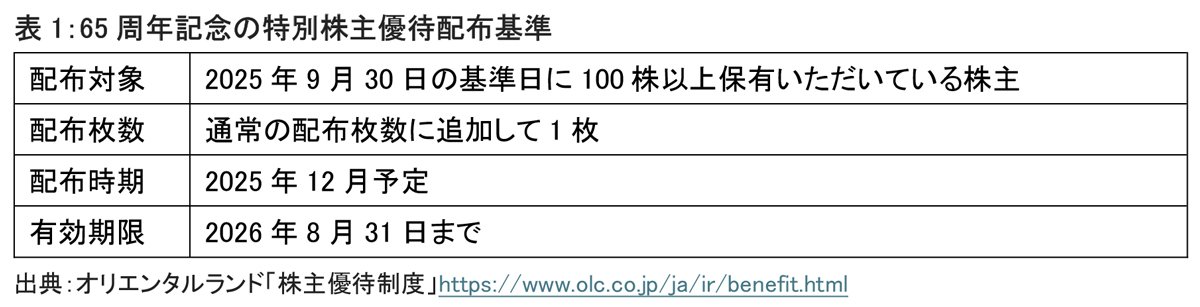 OLCは1960年に創立しました。そこで今年は65周年記念の特別株主優待として、9月30日時点で100株以上を保有する株主に、「1デーパスポート」(入園券)1枚を配布するのです(表1)。
