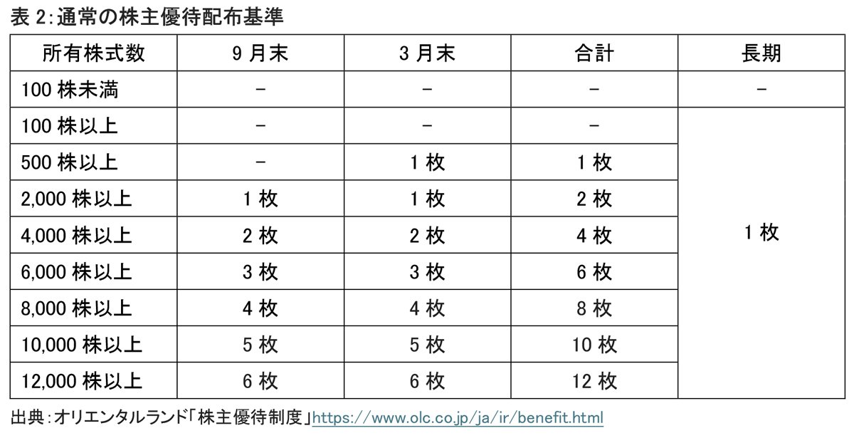 通常の株主優待を確認すると、所有株数に応じてチケットの枚数が増えます(表2)。ちょっとビックリしました。正直、あまりお得感が無いからです(苦笑)。
