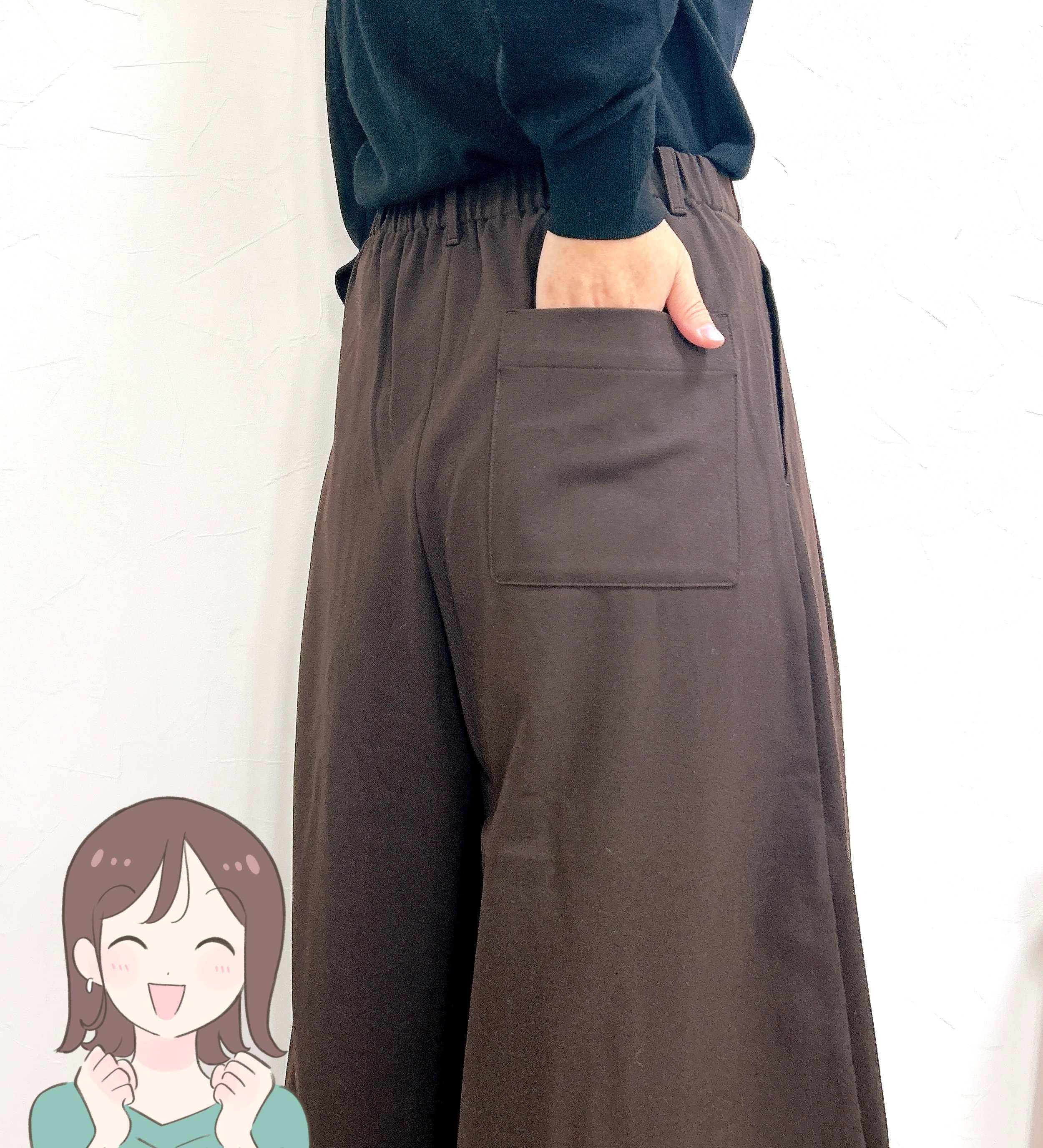 またサイドのポケットに加え、右のお尻側にも大きなポケットが付いているのが嬉しい。オシャレなアクセントだし、スマホがすっぽり入る深さで便利なんです!