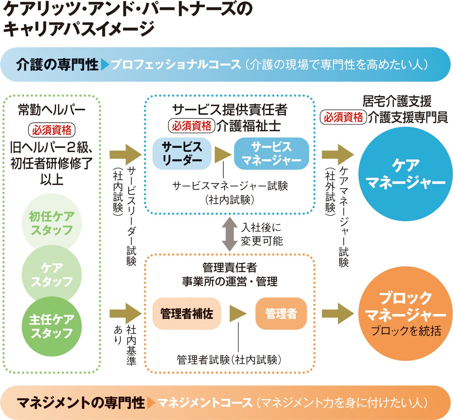 キャリアパスは大きく福祉領域とマネジメント領域に分かれる。新卒社員はまず現場のケアスタッフとしてスタートし、福祉領域ではサービス提供責任者(品質向上リーダー)→ケアマネージャー、マネジメント領域では管理責任者→エリアマネージャー→ブロックマネージャーと、それぞれ昇格していく仕組みだ。