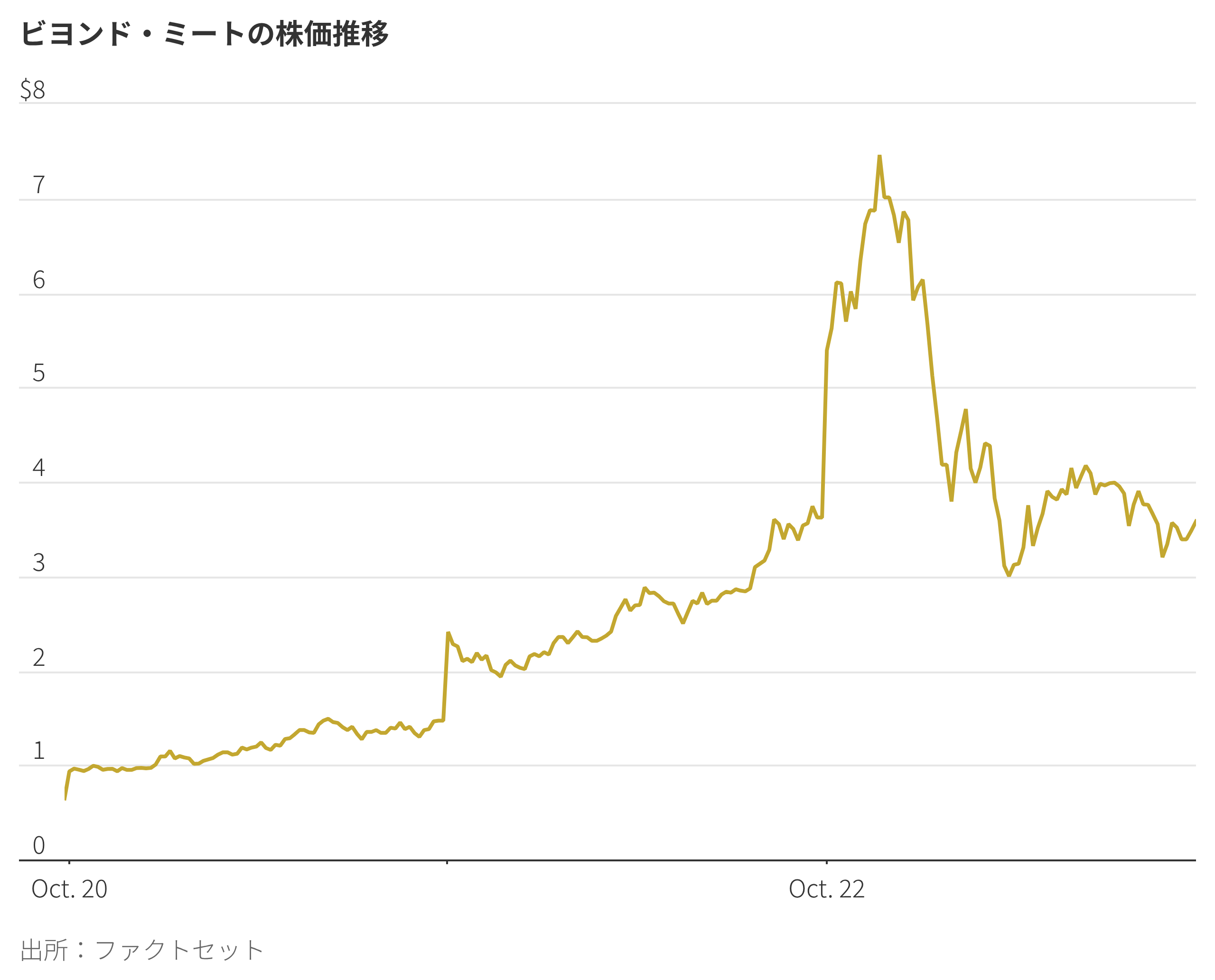 植物由来の代替肉を手掛ける米ビヨンド・ミートは長年、より多くの消費者に牛肉から、ジャガイモでんぷんとエンドウ豆タンパク質で作った自社のパティに切り替えるよう説得するのに苦労してきた。しかし、ミーム株(はやり株)のトレーダーたちは全力で同社株を買いに向かっている。ビヨンド・ミートの株価は22日、急騰後に上昇分の大半を失い、1.1%安で引けた。ファクトセットによると、同社株はこの日、20億株超が売買され、米国株で2番目に出来高の多い銘柄となり、オンライン投資フォーラムの主要な焦点となった。ビヨンド・ミート株は今週に入り450%超上昇している。この株価急騰は、ウォルマートが新しい6個入り「バリューパック」を含む同社製品の販売を2000店舗以上で拡大する、とビヨンド・ミートが21日に発表したことを受けたものだ。同社は先週、希薄化を伴う債務関連取引の概要を示し、株価が1ドルを割り込んでいた。