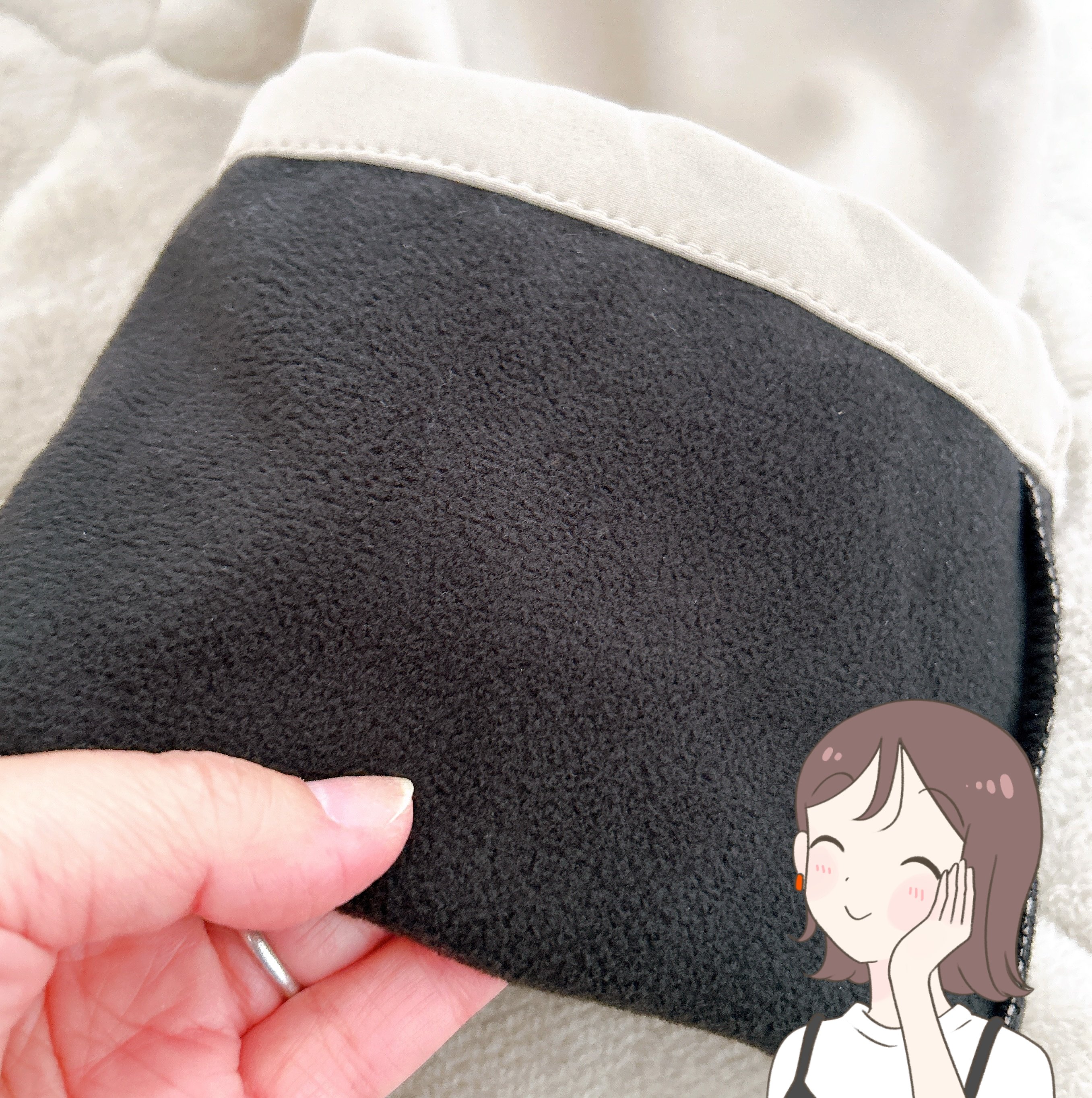 表面はサラッとモチモチした触り心地。裏側はフリースになっていて、はいた瞬間からポカポカしてきます。フィット感のあるデザインのため、冷たい風も通しにくいのが魅力!