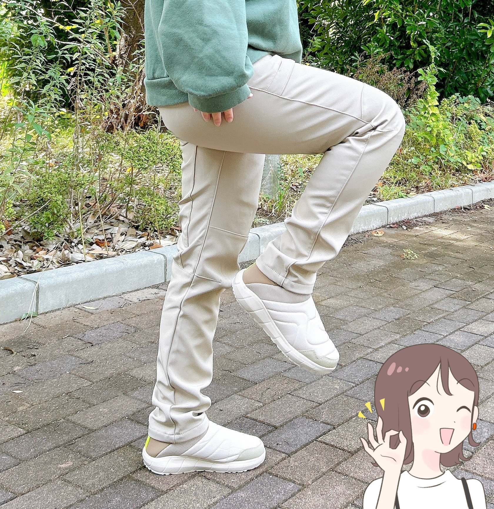 トップスはスウェットやパーカーなどのボリュームのあるものを選べば、さらに脚長効果バツグンに!