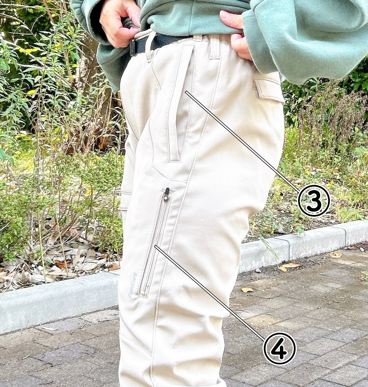 さらにサイドポケットと、左の太ももにはファスナーポケットが縦に付いています。
