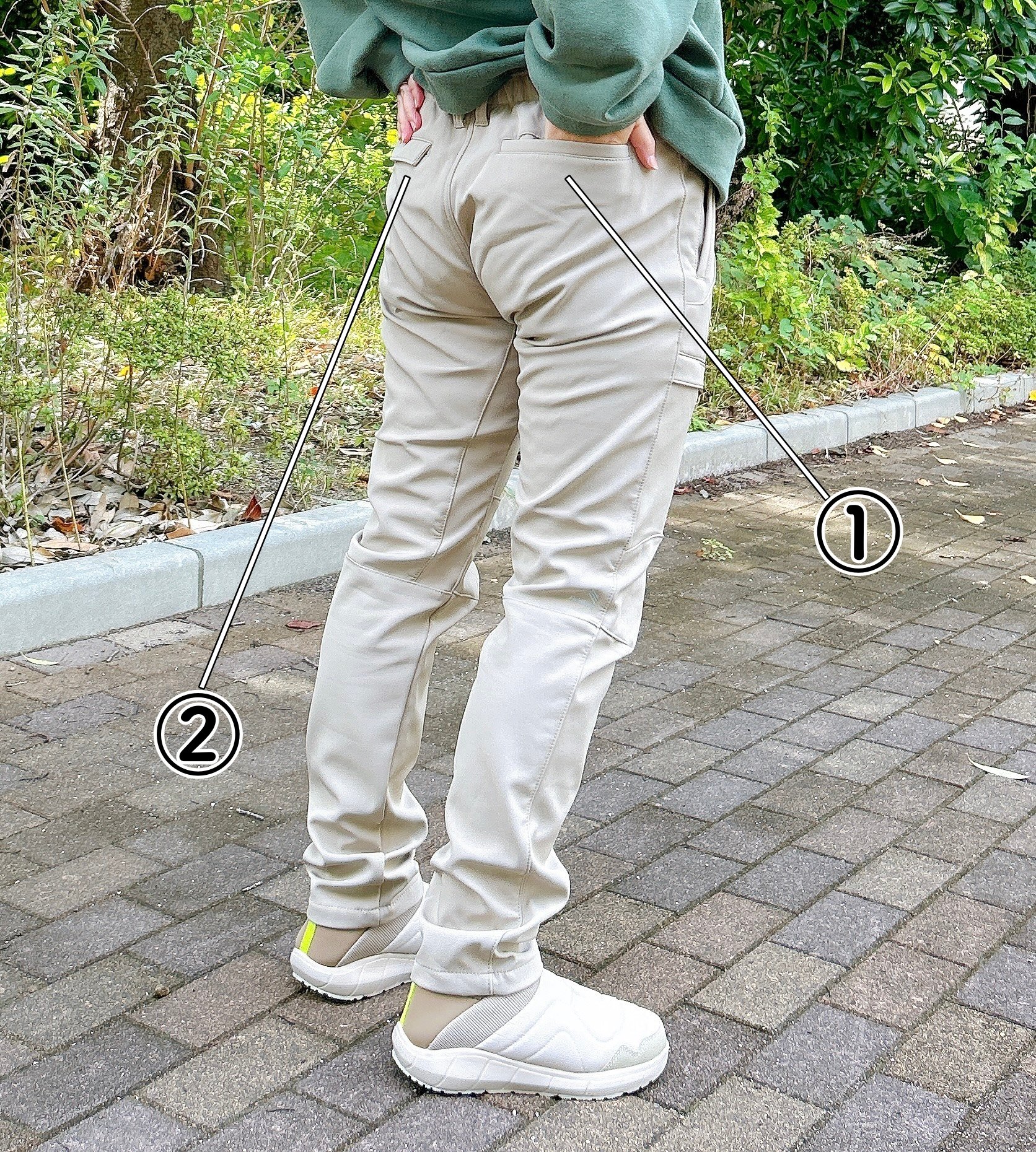そして右の太ももには、ボタン付きの大きなフラップポケットまであるんです!スマホや鍵、ペンなどの小物が収納でき、バッグいらずの便利さですよ。