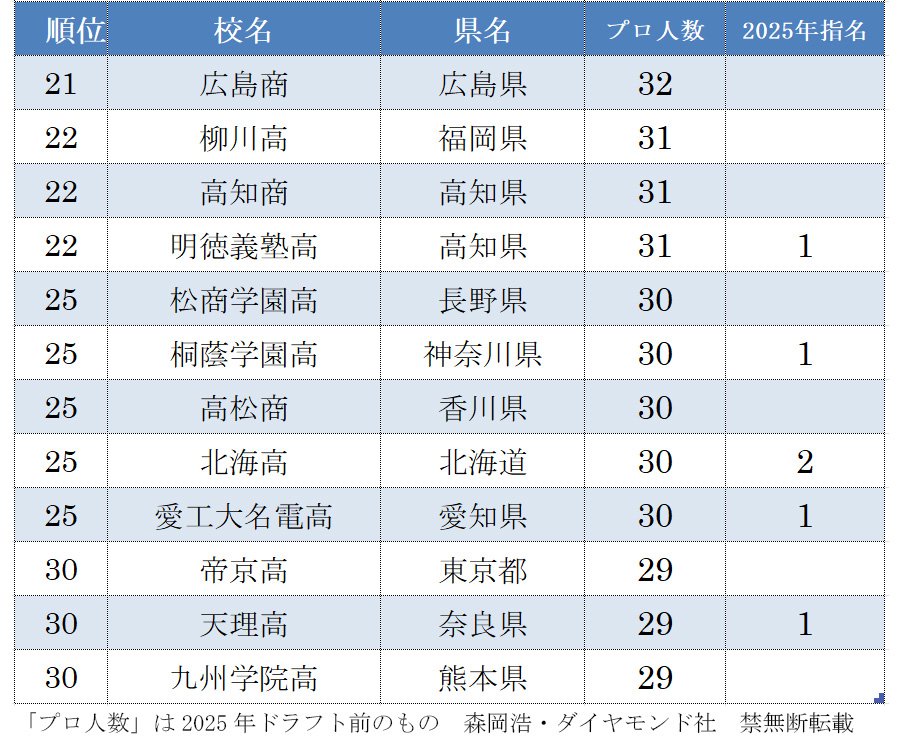 プロ野球選手を多く生んだ高校ランキング2025【ベスト32】2位PL学園、1位は? 森岡 浩: 姓氏研究家、野球史研究家 予測・分析ニッポンなんでもランキング! 2025年10月24日 19:50 記事をクリップ URLをコピー 記事を印刷 Xでシェア Facebookでシェア はてなブックマークでシェア LINEでシェア noteでシェア プロ野球選手を多く生んだ高校ランキング 21~30位 出身高校別プロ入りランキング2025【全32校完全版】21~30位。「プロ人数」は2025年ドラフト前のもの 森岡浩・ダイヤモンド社 禁無断転載 拡大画像表示 次のページ 沖縄尚学高、京都国際高、慶応高は? 2 3 4 5 6 記事をクリップ URLをコピー 記事を印刷 Xでシェア Facebookでシェア はてなブックマークでシェア LINEでシェア noteでシェア 有料会員限定機能です詳細はこちら おすすめの会員限定記事 「定年後の働き方」を決める前に絶対にやるべき“たった1つのこと”とは?【社労士が解説】 メールで「~してください」を「~して下さい」と漢字で書く人たちの共通点〈見逃し配信〉 関連記事 夏の甲子園・勝利数ランキング2024【ベスト105完全版】早稲田実業が7位、1位は? 森岡 浩 甲子園出場歴のある高校の割合が高い都道府県ランキング2023【全47都道府県・完全版】 森岡 浩 プロ野球選手を多く生んだ高校ランキング2023!【ベスト30完全版】 森岡 浩 夏の甲子園・勝利数ランキング2022【ベスト102完全版】 森岡 浩 特集 あなたにおすすめ