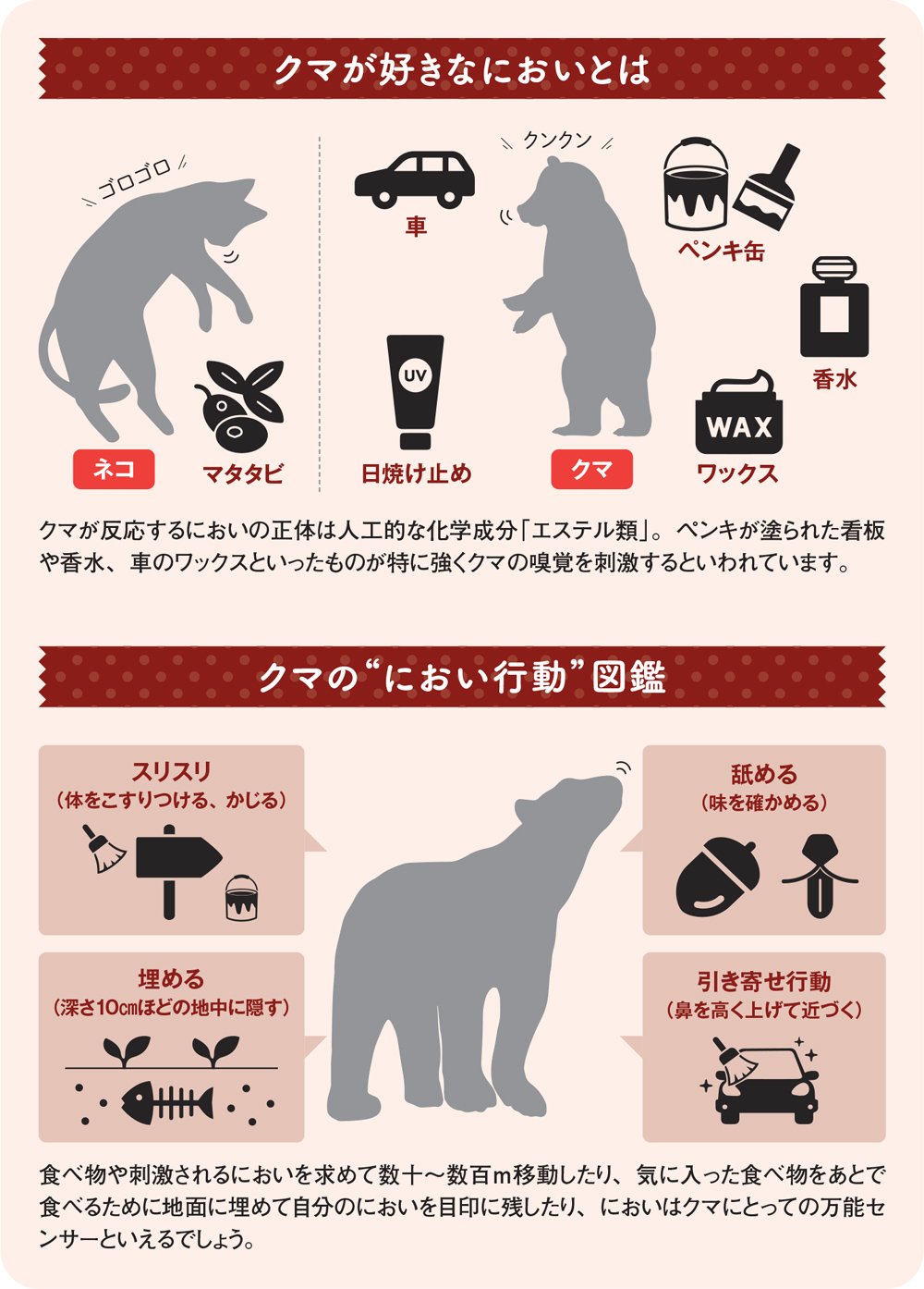 ネコがマタタビにうっとりするように、クマにも思わず反応してしまう“気持ちのいいにおい”があります。なんとそのにおいは、ペンキや香水、車のワックスといった人工的なものなのです。