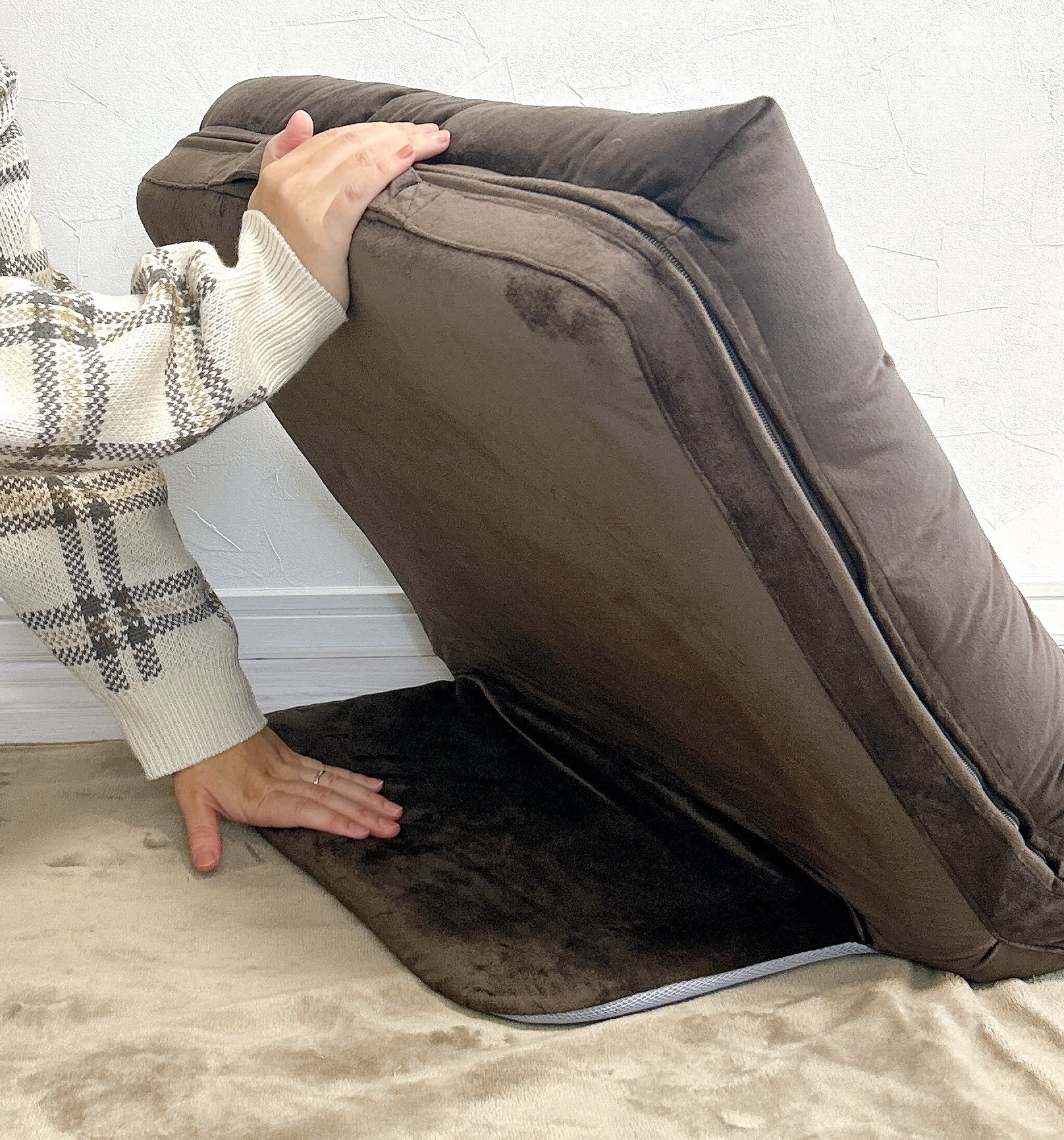 すべて倒した状態にして座れば座布団に。ちょっとした高さがあるから足を伸ばして座ったり、あぐらをかいたりもできます。