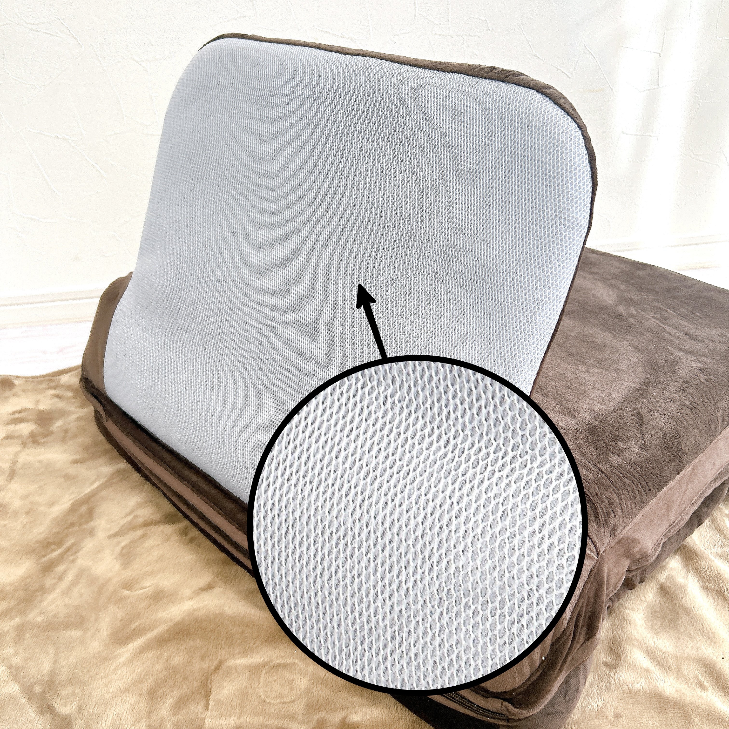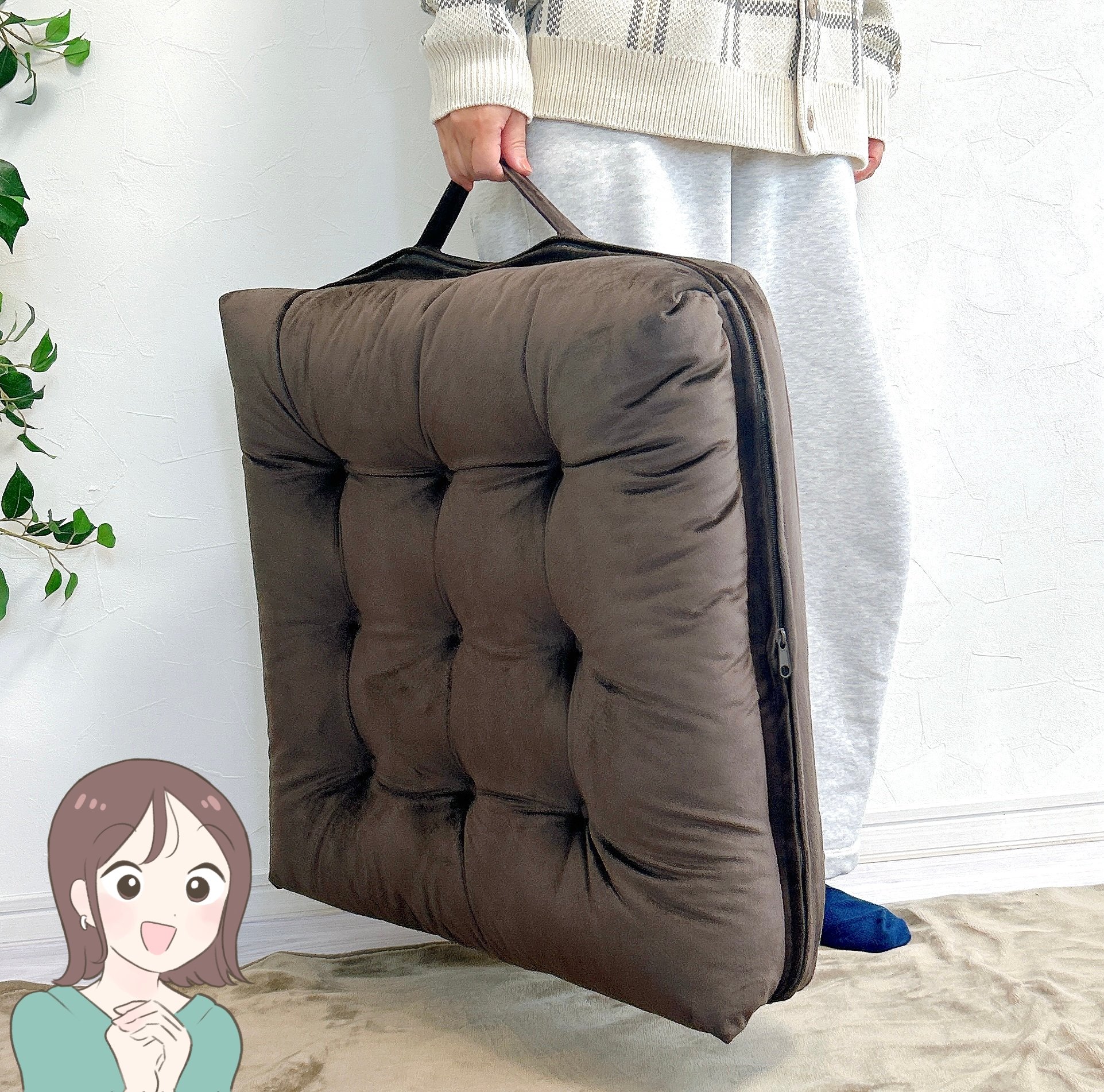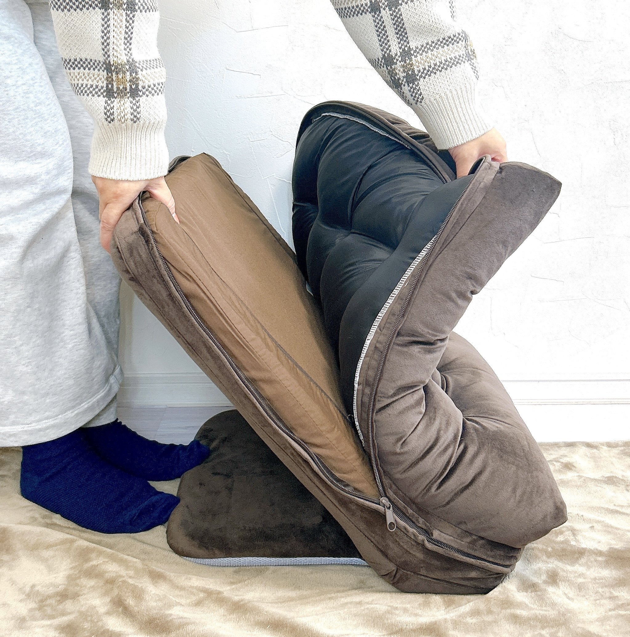 サイズは(約)縦57×横44×高さ16cmで、耐荷重は90kg以下が推奨されています。背もたれにすると肩までしっかり支えられ、本当にソファに座っているような気持ちよさ!