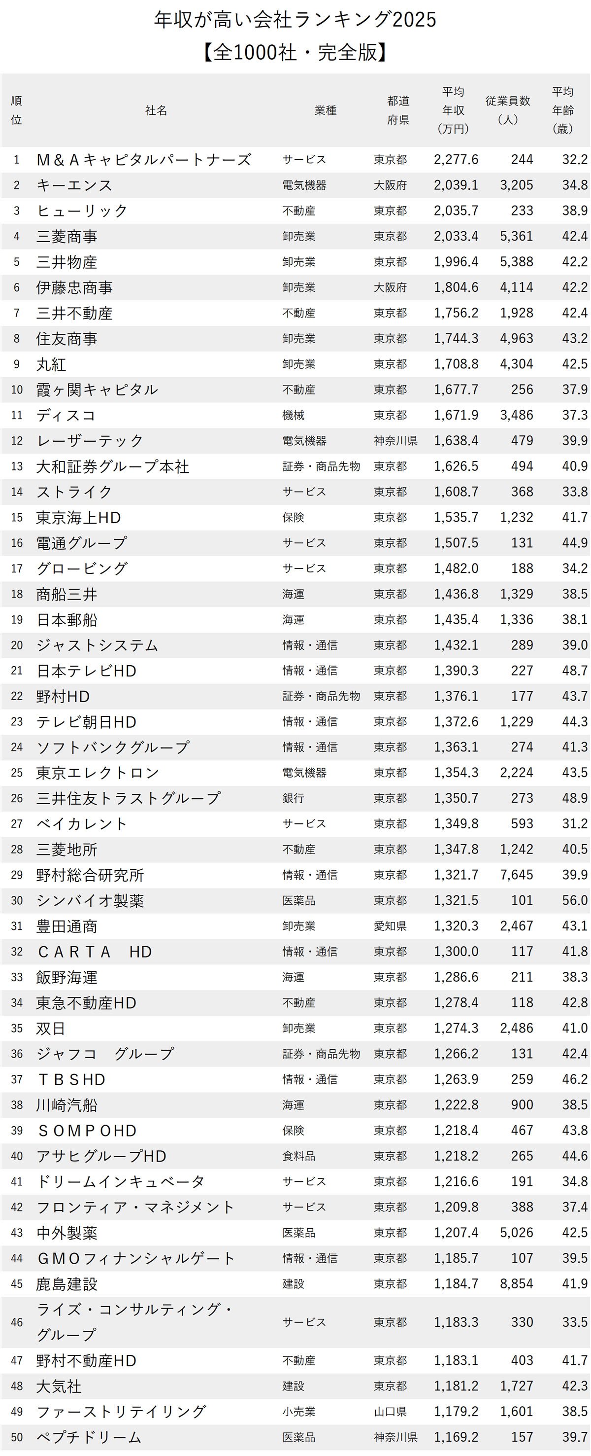 年収が高い会社ランキング2025【全1000社・完全版】年収1000万円超は133社! ダイヤモンド・ライフ編集部 予測・分析ニッポンなんでもランキング! 2025年11月3日 10:00 記事をクリップ URLをコピー 記事を印刷 Xでシェア Facebookでシェア はてなブックマークでシェア LINEでシェア noteでシェア 拡大画像表示 次のページ 51位から100位はこちら 1 2 3 4 5 記事をクリップ URLをコピー 記事を印刷 Xでシェア Facebookでシェア はてなブックマークでシェア LINEでシェア noteでシェア 有料会員限定機能です詳細はこちら おすすめの会員限定記事 メールで「~してください」を「~して下さい」と漢字で書く人たちの共通点〈見逃し配信〉 40代タイミーおじさんが「正直もう働きたくない」天丼チェーン店のあきれた実態 関連記事 年収が高い会社ランキング2024【従業員の平均年齢40代前半・1000社完全版】5大商社に迫る年収1500万円、6位の企業とは? ダイヤモンド・ライフ編集部 年収が高い会社ランキング2024【従業員の平均年齢40代後半・191社完全版】年収1000万円超の16社とは? ダイヤモンド・ライフ編集部 年収が高い会社ランキング2024【平均年齢30代・従業員100人未満】全200社完全版、地銀最大手や大井競馬場の所有会社の年収は? ダイヤモンド・ライフ編集部,松本裕樹 年収が高い会社ランキング2024【従業員100人未満・500社完全版】1位は2000万円超!フジ・メディア・HDを超えるトップは? ダイヤモンド・ライフ編集部,松本裕樹 特集 あなたにおすすめ