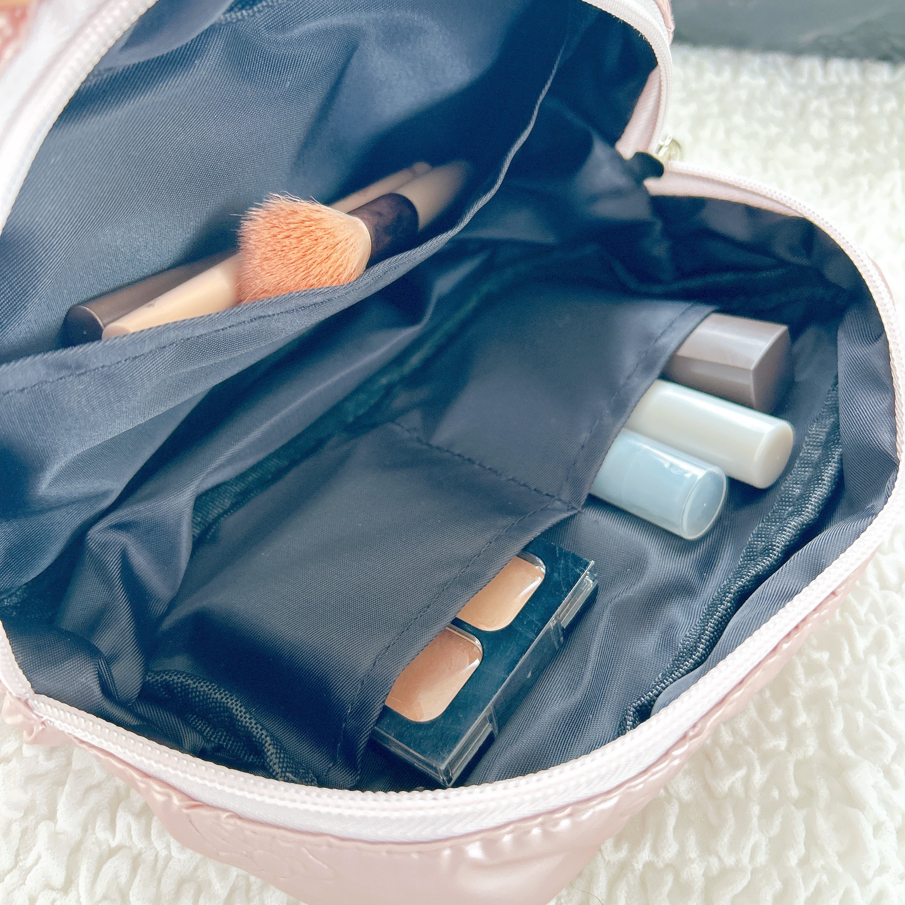 小ポケットにはアイシャドウやリップ、コンシーラーを。大ポケットにはアイライナーやブラシなどの細長いものをまとめて収納可能。