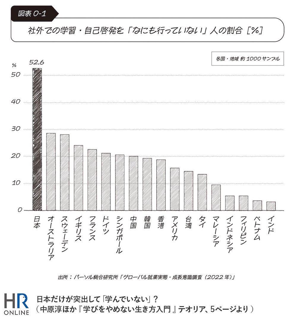 日本の大人は、世界でいちばん学んでいない――書籍『学びをやめない生き方入門』の冒頭には、そんな衝撃的なデータが掲げられています。