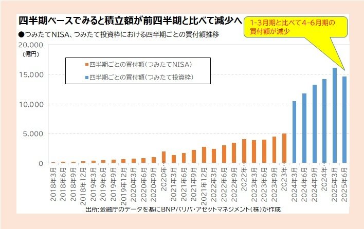 2つめは、つみたて投資枠の買付額についてです。2025年上期は3.1兆円(前年同期は2.2兆円)となっていることから、買付額は好調が維持できているように見えます。しかし、四半期ごとで見ると、1~3月の1兆6111億円に対して、4~6月は1兆4605億円となり、直近は1500億円ほど減少に転じています。つみたて投資枠でも、年が変わった1月は買付額が膨らみやすい傾向がありますが、それでも新NISAが始まって順調に拡大してきた買付額が4~6月期に減少しているのは気になる動きです。