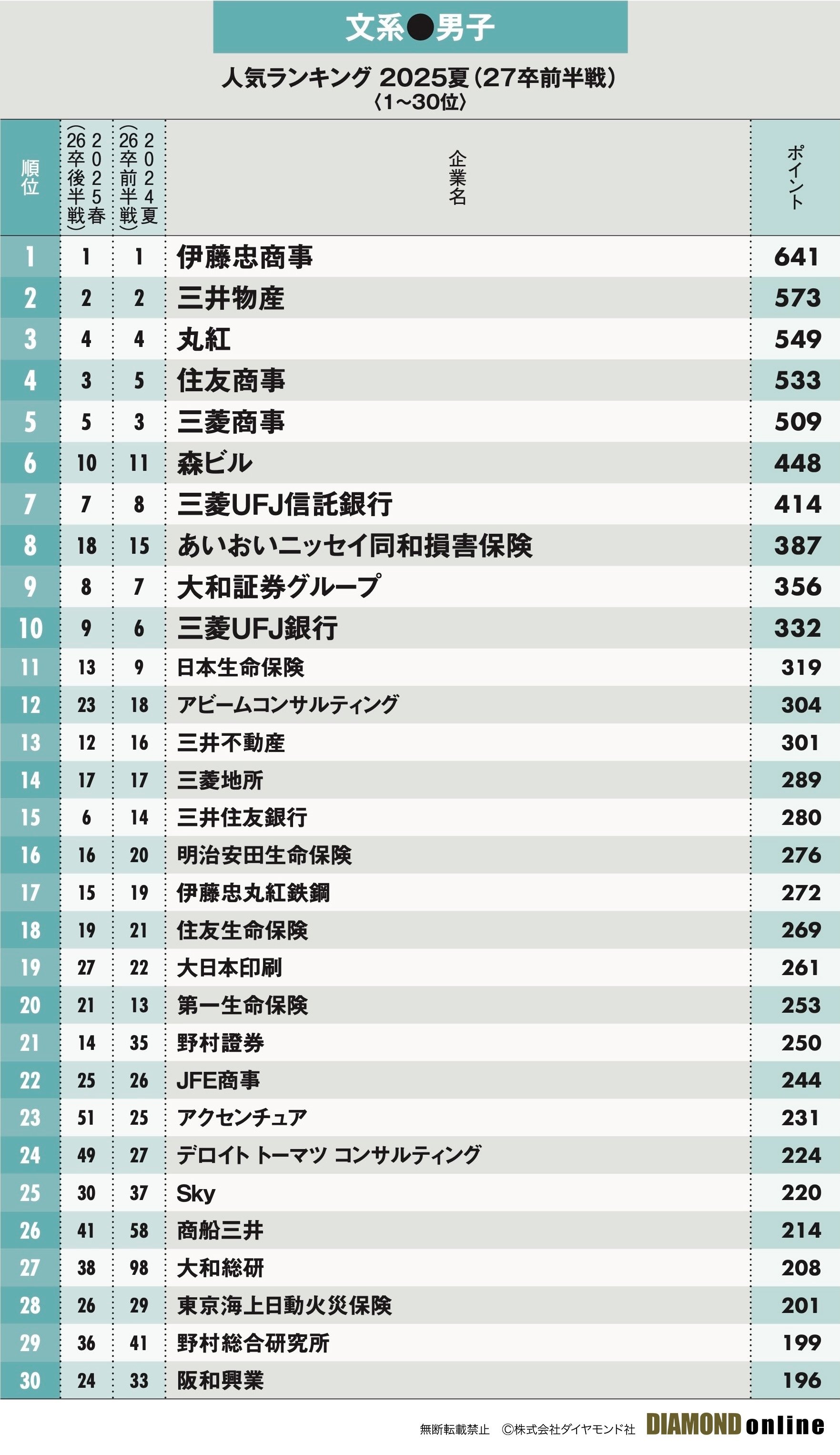 伊藤忠商事が前半戦調査で7年連続1位となったほか、三井物産(2位)、丸紅(3位)、住友商事(4位)、三菱商事(5位)と総合商社がトップ5を独占した。