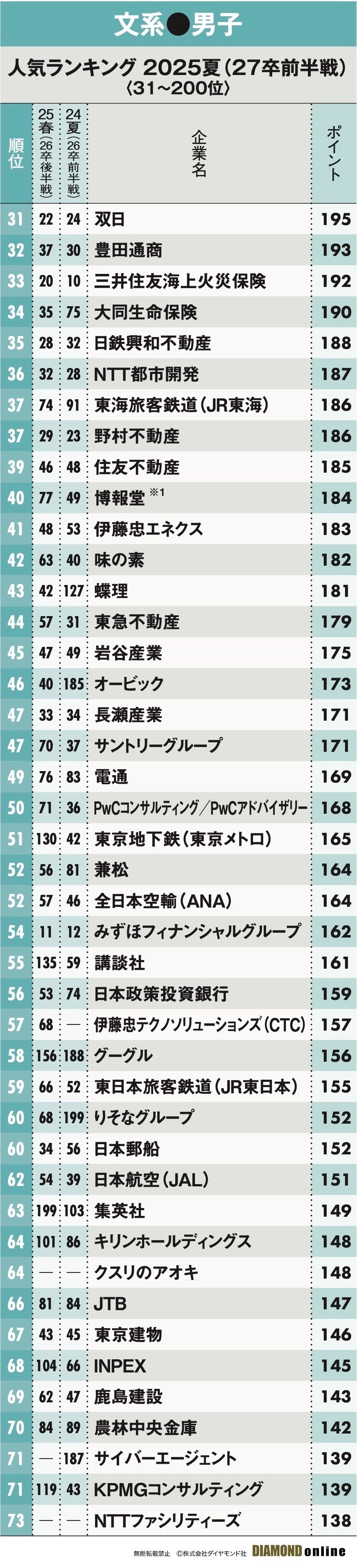 就職人気企業ランキング27年卒【文系男子・ベスト200】3位は丸紅、1位は? 高村太朗: ダイヤモンド・ヒューマンリソース 経営企画室 室長 予測・分析就職人気ランキング2027年卒前半戦調査 2025年11月10日 8:30 記事をクリップ URLをコピー 記事を印刷 Xでシェア Facebookでシェア はてなブックマークでシェア LINEでシェア noteでシェア 拡大画像表示 次のページ 就職人気企業ランキング27年卒【文系男子・ベスト74〜115】はこちら 1 2 3 4 5 [{:code=>"10137896", :name=>"伊藤忠商事"}, {:code=>"10138205", :name=>"三井物産"}, {:code=>"10137918", :name=>"丸紅"}, {:code=>"10138426", :name=>"住友商事"}, {:code=>"10142180", :name=>"大和証券グループ本社"}, {:code=>"10206472", :name=>"三菱UFJフィナンシャル・グループ"}, {:code=>"10067847", :name=>"森ビル"}] この記事に関連する企業 伊藤忠商事 三井物産 丸紅 住友商事 大和証券グループ本社 三菱UFJフィナンシャル・グループ 森ビル 記事をクリップ URLをコピー 記事を印刷 Xでシェア Facebookでシェア はてなブックマークでシェア LINEでシェア noteでシェア 有料会員限定機能です詳細はこちら おすすめの会員限定記事 「定年後の働き方」を決める前に絶対にやるべき“たった1つのこと”とは?【社労士が解説】 絶対に採用しないで!面接で「40代から成長しなくなる人」を一発で見抜く魔法の質問〈2025年度上期・会員ベスト2〉 関連記事 大企業志向が7割!5大総合商社と大手金融に人気が集まる【就職人気企業ランキング2026卒就活〈後半戦〉調査】 高村太朗 「売り手市場」でも就活の常識は様変わり!“2025年卒”笑う学生、泣く学生の内定格差 古井一匡 15年前の理系の「就職人気ランキング」今と違いすぎて愕然とする… 筒井智之 東大・京大生の就職先ランキング・全17業界670社を大公開!エリートから支持されている企業はどこだ? ダイヤモンド編集部,山本 輝 特集 あなたにおすすめ