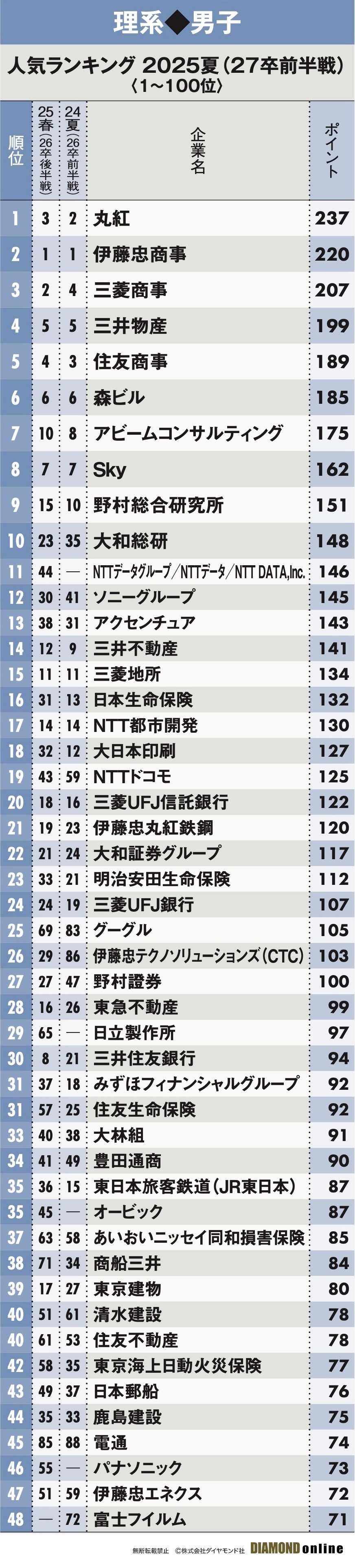 理系男子で初の1位を獲得した丸紅をはじめ、伊藤忠商事(2位)、三菱商事(3位)、三井物産(4位)、住友商事(5位)と文系男子同様総合商社がトップ5を独占した。
