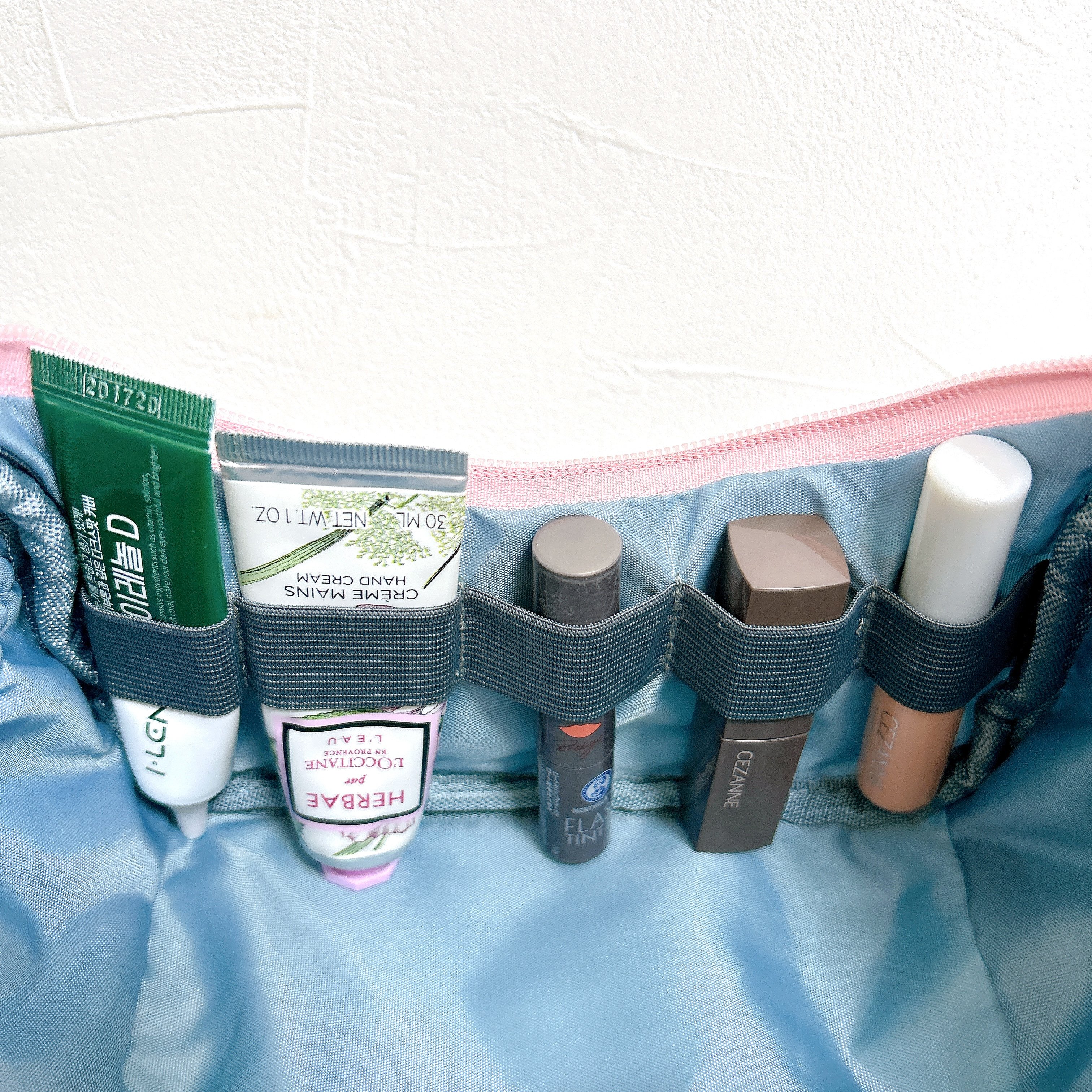 そして手前の側面にはゴムバンドが5つ並んでいて、リップやコンシーラー、ハンドクリームなどを立てて挟んで収納できるようになっていました。小物が仕分けできて、どこに何があるのかもう迷子になりません!
