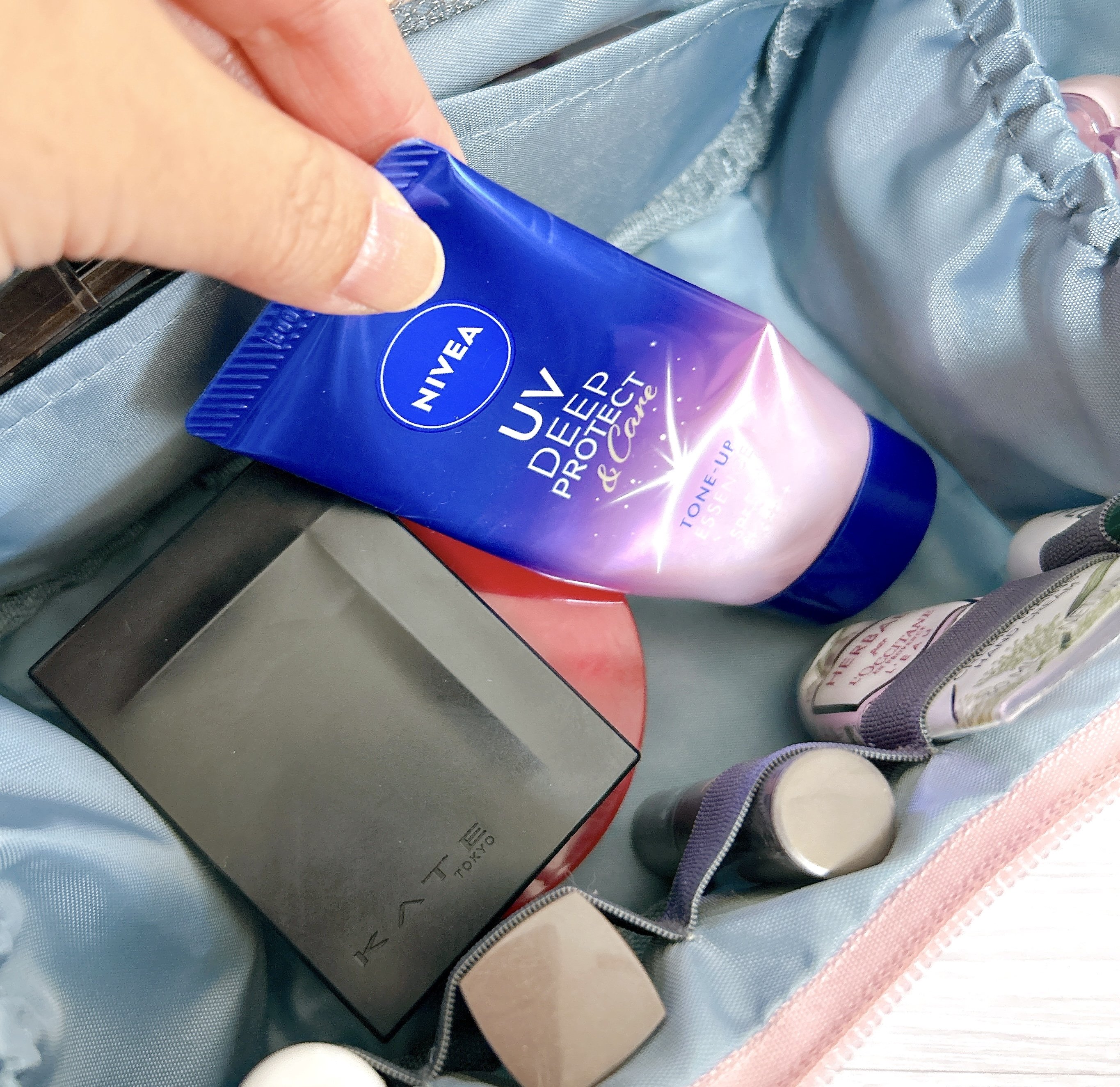メインスペースはマチがたっぷりあるから、ファンデーションや日焼け止めクリームを入れてもまだまだ余裕たっぷり。かさばるアイテムも並べて収納できちゃいます。ゴチャゴチャせずにスッと取り出せてストレスフリーです!