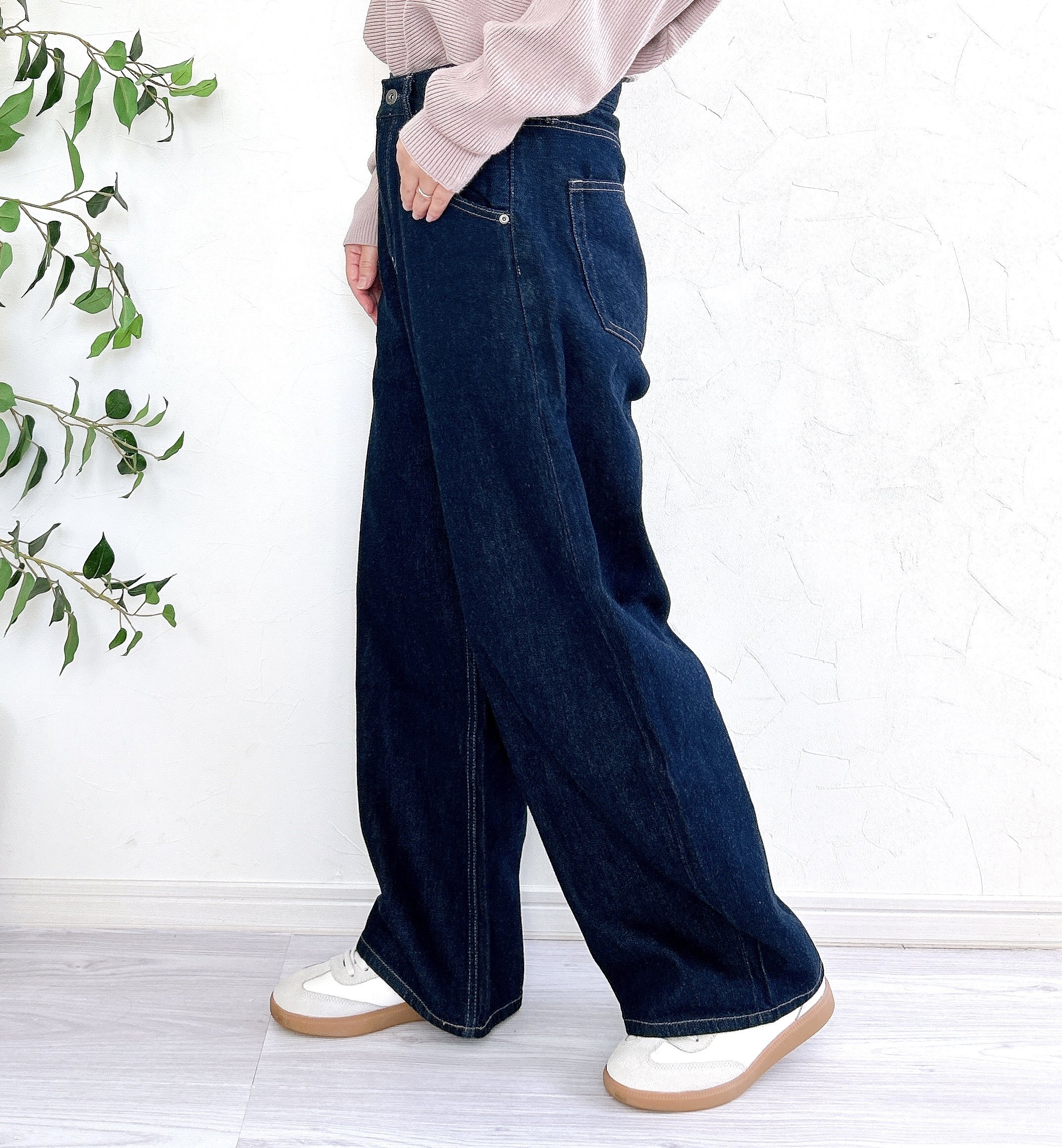 外側にボリュームを持たせた、カーブシルエットが今っぽいデザインです。股上はやや深めのハイウエストで、ぽっこりお腹が目立たずに脚がスラッと長く見えて嬉しい!