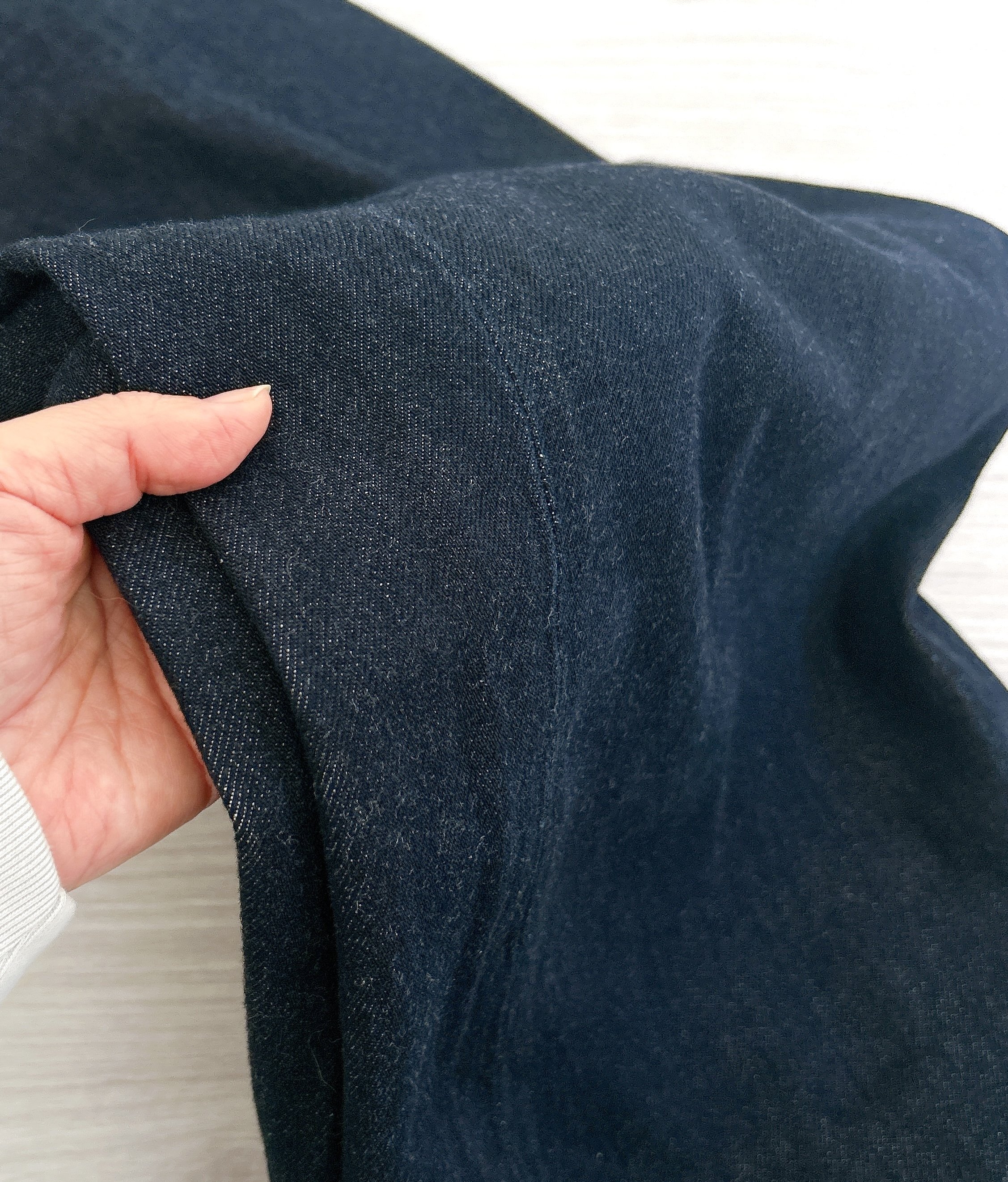 お手入れは、弱い水流での洗濯が可能です。濃色は色落ちの心配があるため、単独洗いが推奨されています。洗濯したところ少し丈が縮んだため、丈が長かった場合でも補正前に一度洗ってみるのと良いかもしれません。