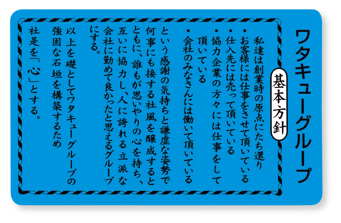 「感謝の気持ち」と「謙虚な姿勢」が、社是「心」を支える基本方針。全社員がこの言葉を記したカードを常時携帯しているという