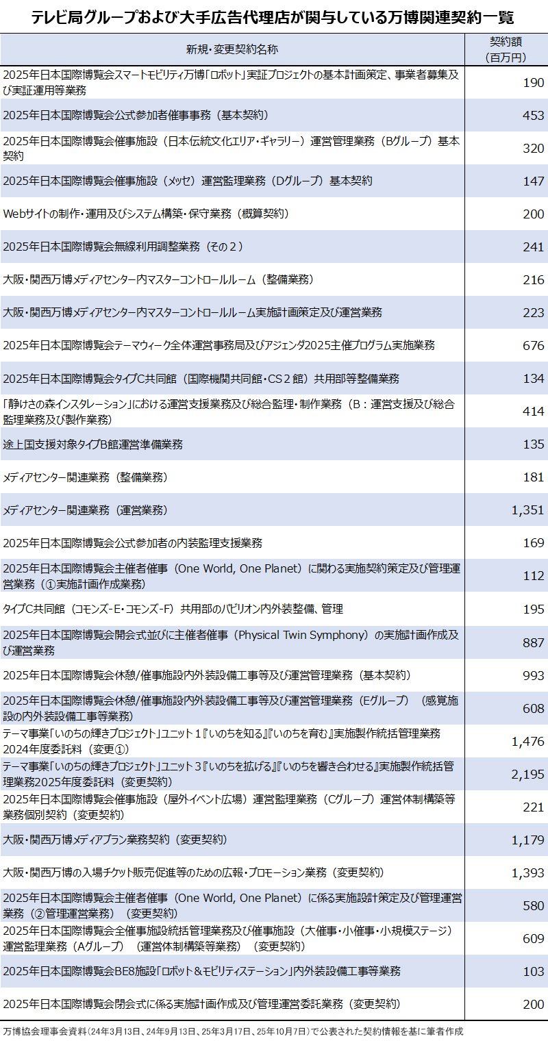 複数の協会理事会資料を読み解くと、テレビ局および大手広告代理店のグループ企業が関与した万博関連契約額の合計は150億円超にのぼる(参照「テレビ局と大手広告代理店が関与している万博関連契約一覧」)。開幕前は批判的な報道が多かったのが一転、会期終盤はポジティブな報道ばかりだった背景には、SNSでの口コミ以外にも、こうした業界の内部事業が大きく関係しているのではないだろうか。もっとも、口コミですら仕掛けた機運醸成の範疇だという声も、広告関係者から漏れ伝わってくる。