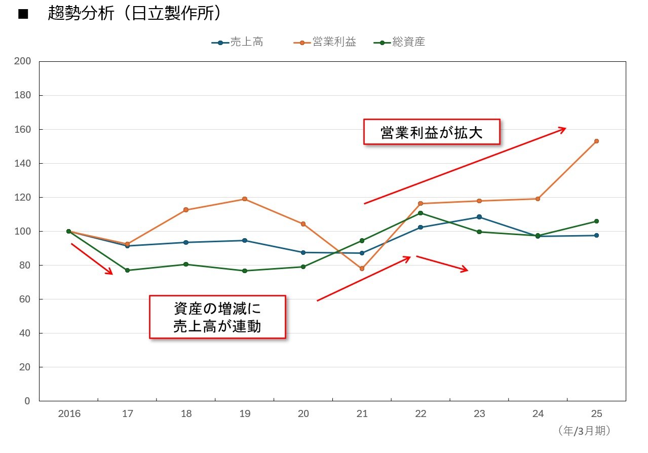 次の図は、日立製作所における16年3月期の売上高、営業利益、総資産を100として、その後25年3月期までに各々がどのように推移したのかをまとめたものだ。こうした分析を、「趨勢(すうせい)分析」と呼ぶ。
