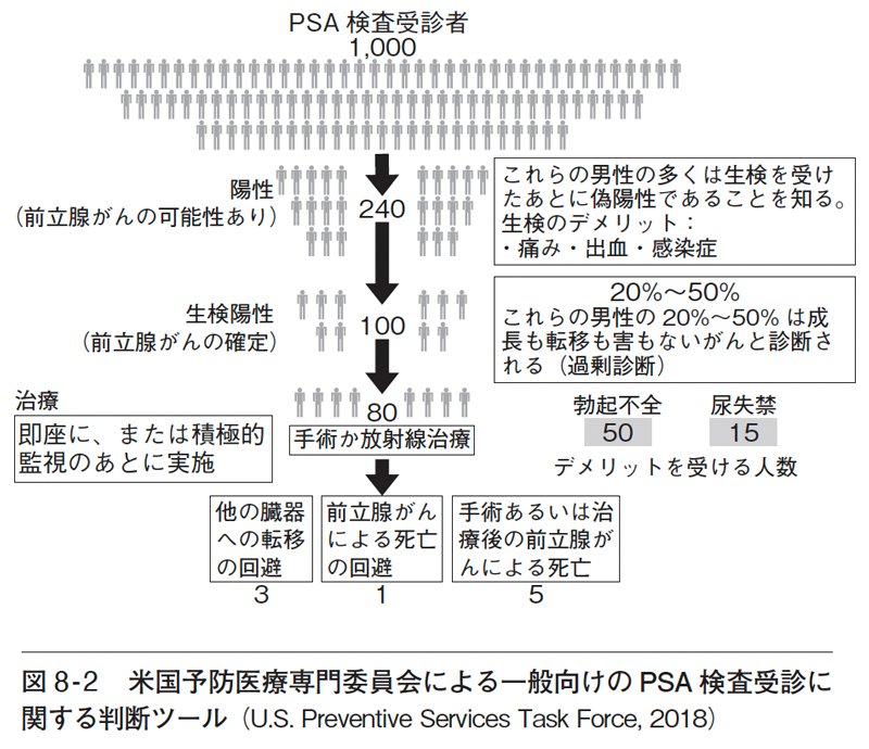 1つは、米国の専門機関である予防医療専門委員会(U.S. Preventive Services TaskForce)が作成した、受診を判断するための一般向けツールである。そこでは、55~69歳の男性1000人が受診したときに受けるメリットとデメリットが、図8-2のように示されている。