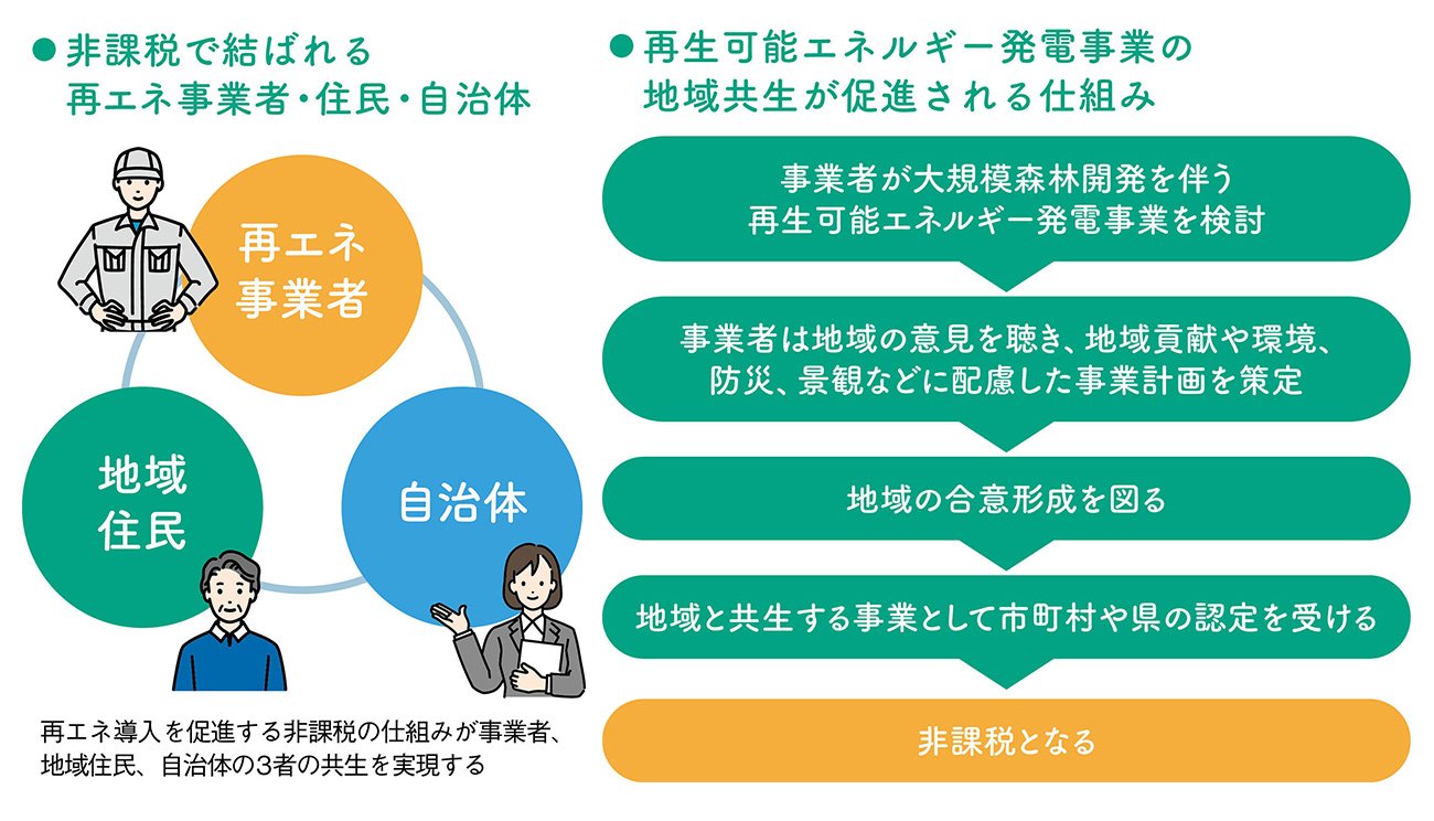 槻田室長は、制度を運用する上で欠かせない点を「事業者は住民に対して事業を一方的に進めるのではなく、住民の不安や懸念に住民が納得がいくまで向き合い説明することが不可欠です。結局は事業者と住民の信頼関係に尽きると思います。さらに都市部と農山部では合意形成の方法も異なるため、地域に根差した方法で進める姿勢が求められます」と指摘する。事業者にとっては税負担を回避できるメリットが得られ、地域住民にとっては生活環境や安心感が守られるという相互利益が生まれる。