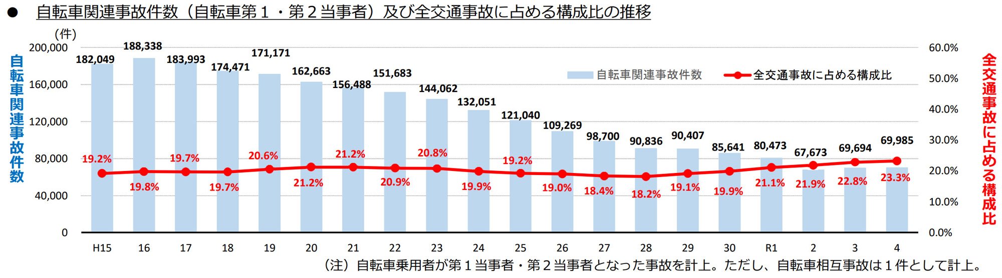 ご存じかどうか。交通事故の発生件数は年々減少している。その一方で「自転車が関わる事故」の数はここ数年大きくは減っていない。交通事故に占める自転車事故の割合はむしろ増加しているのだ。