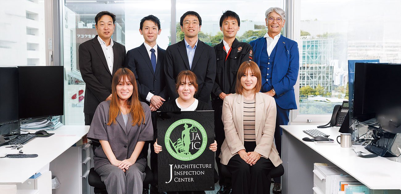 【J建築検査センター 福岡支店】2023年に福岡市天神に開設された福岡支店のメンバーと丹野智幸社長(後列一番右)。オフィスは駅近で、ワークとライフの両面を楽しめる好立地にある
