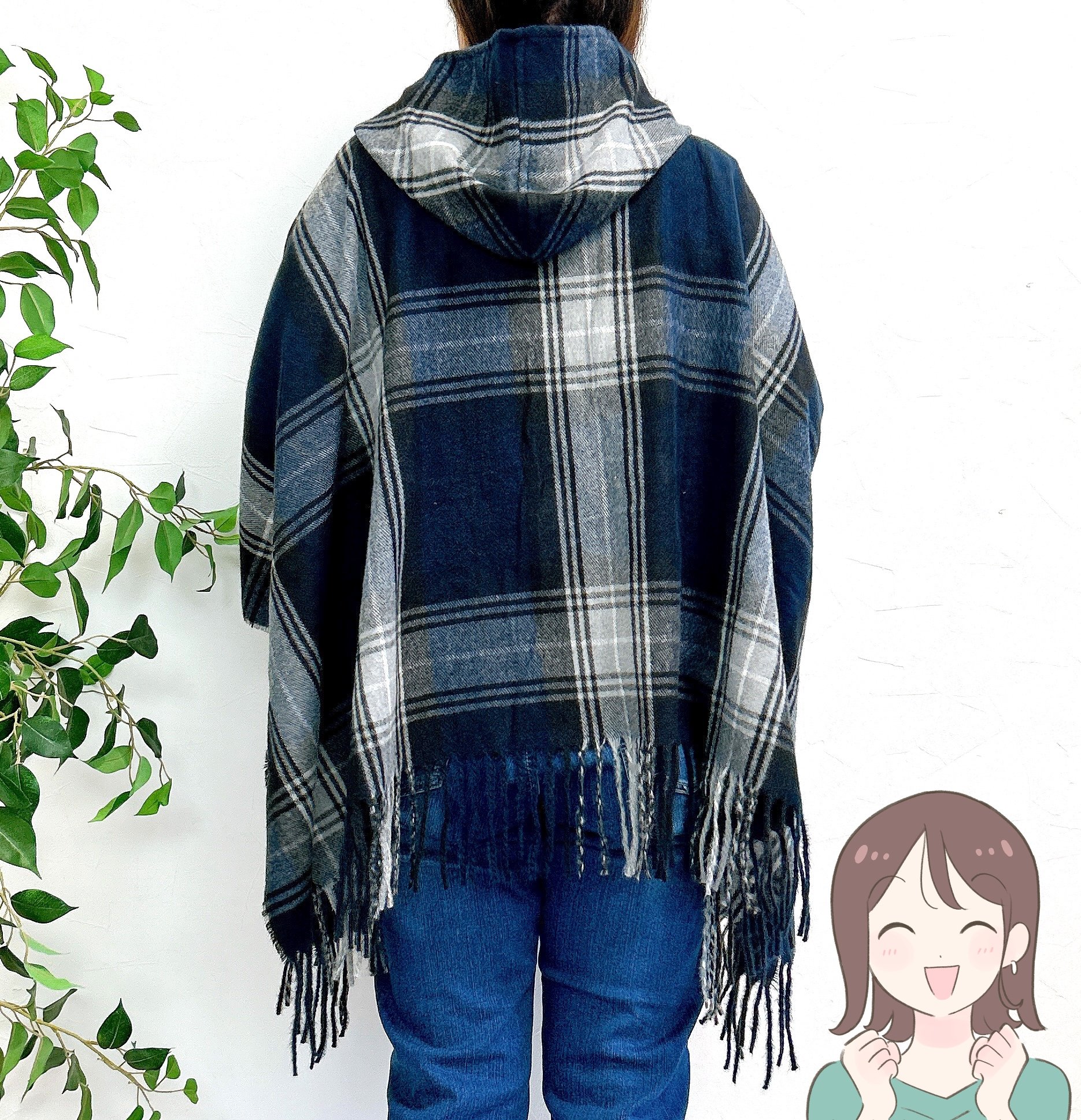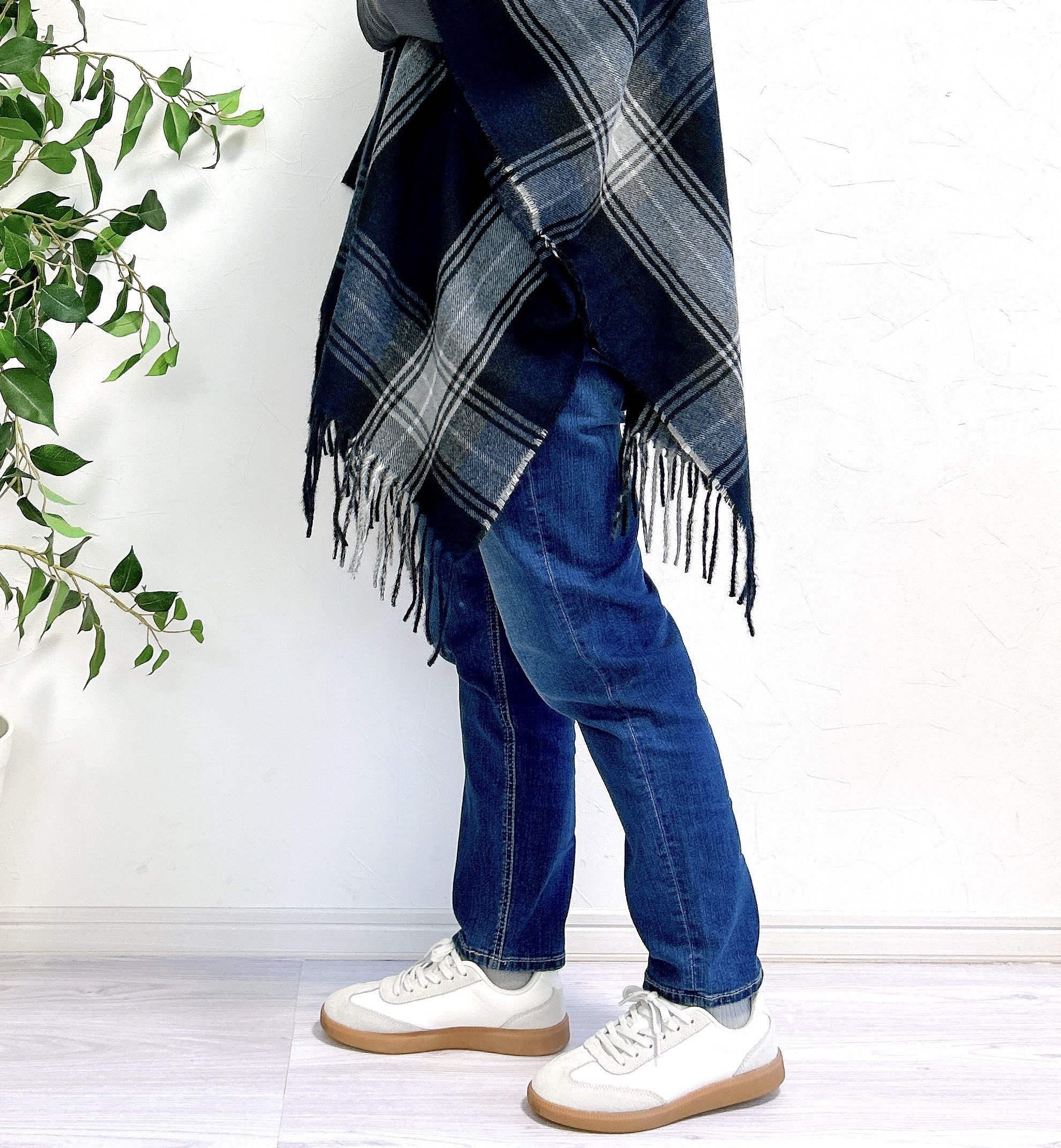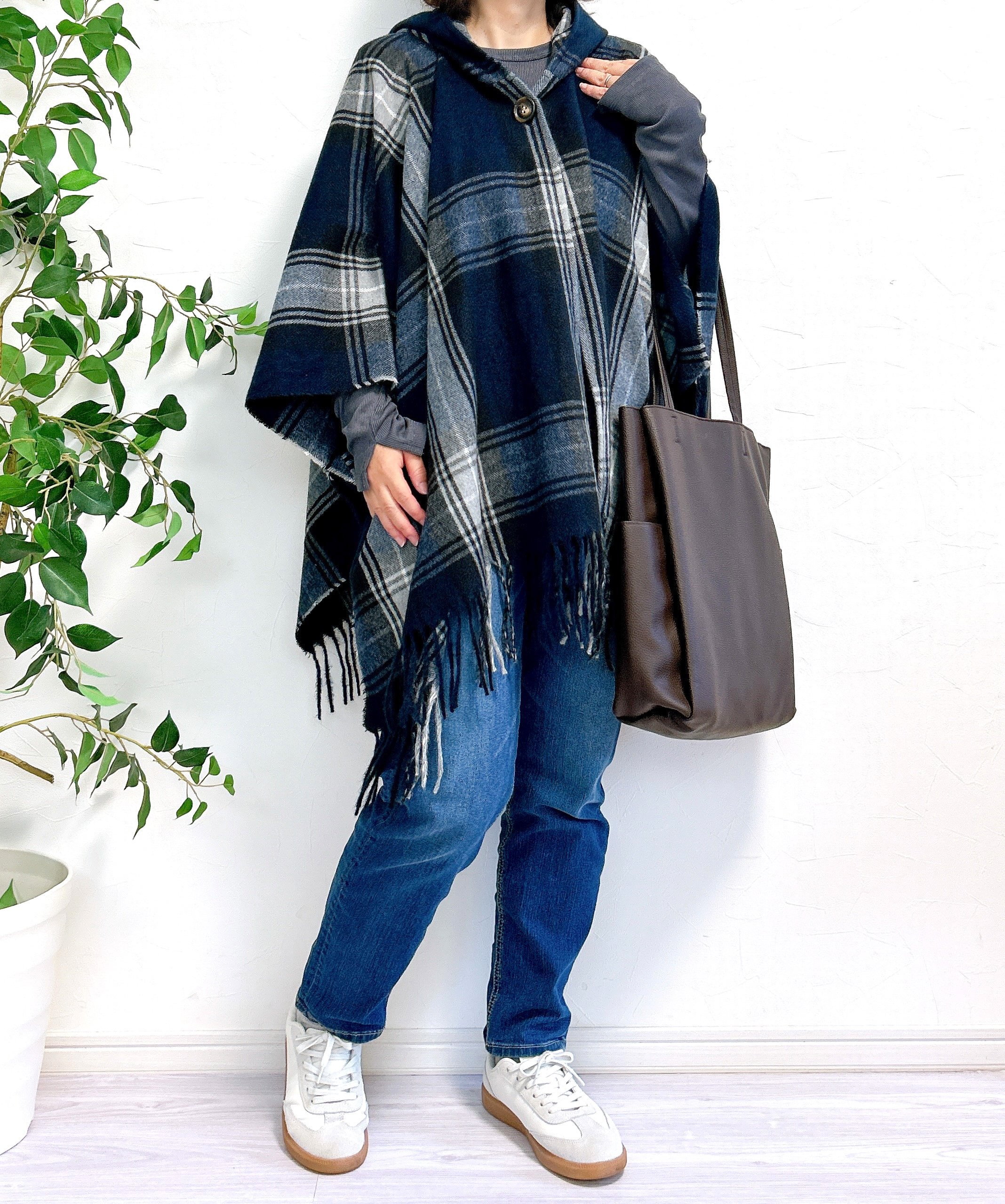 広げたサイズは全長150×幅124cmで、丈はお尻や太ももにかかるくらいの長さがあります。裾のフリンジでお尻を隠してくれるから、さり気なく体型カバーできて嬉しい!