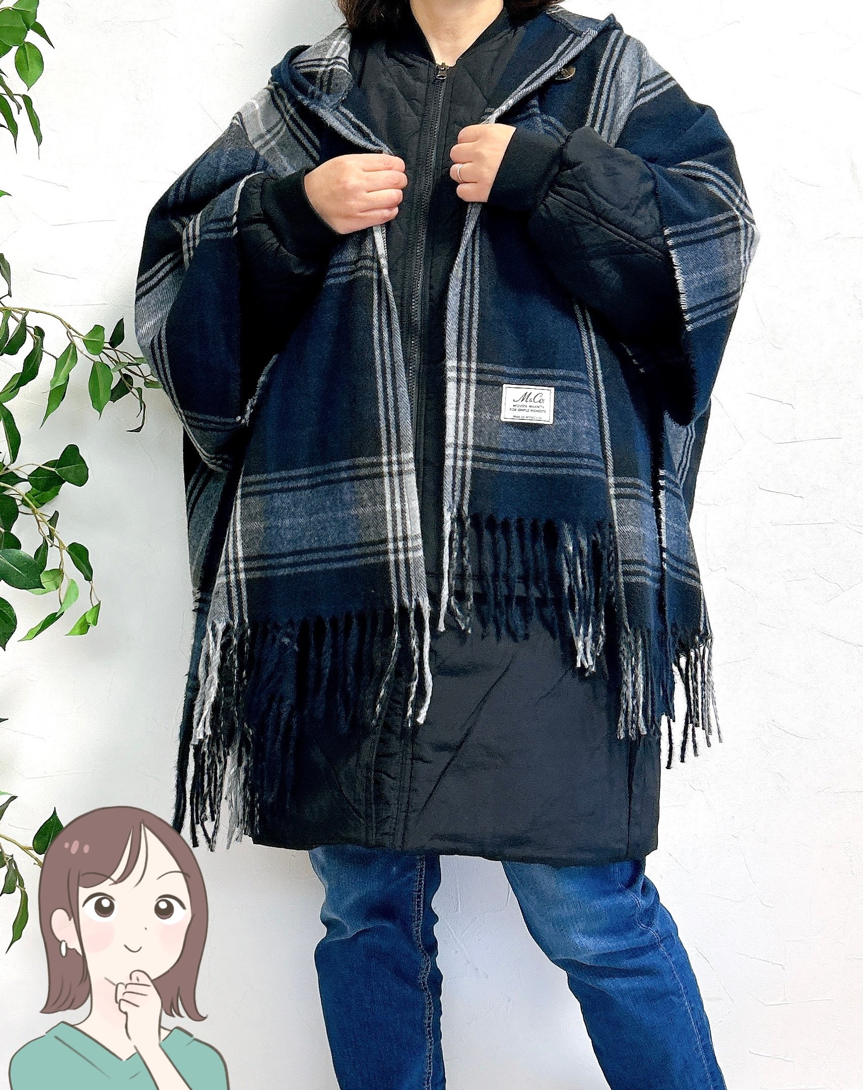 寒くなってきたら、ダウンコートなどの上から羽織って防寒対策するのもおすすめ!少しボリューム感は出てしまいますが、ゆったりしたサイズなので厚地のアウターの上からでも羽織れました。保温性がさらに高まって、より暖かく過ごせそうです。