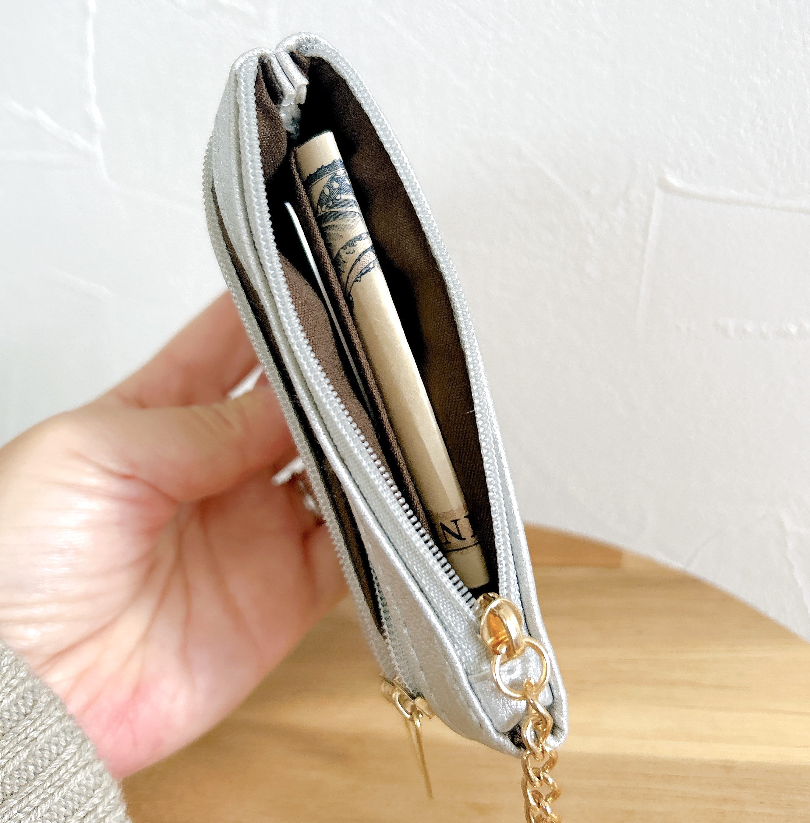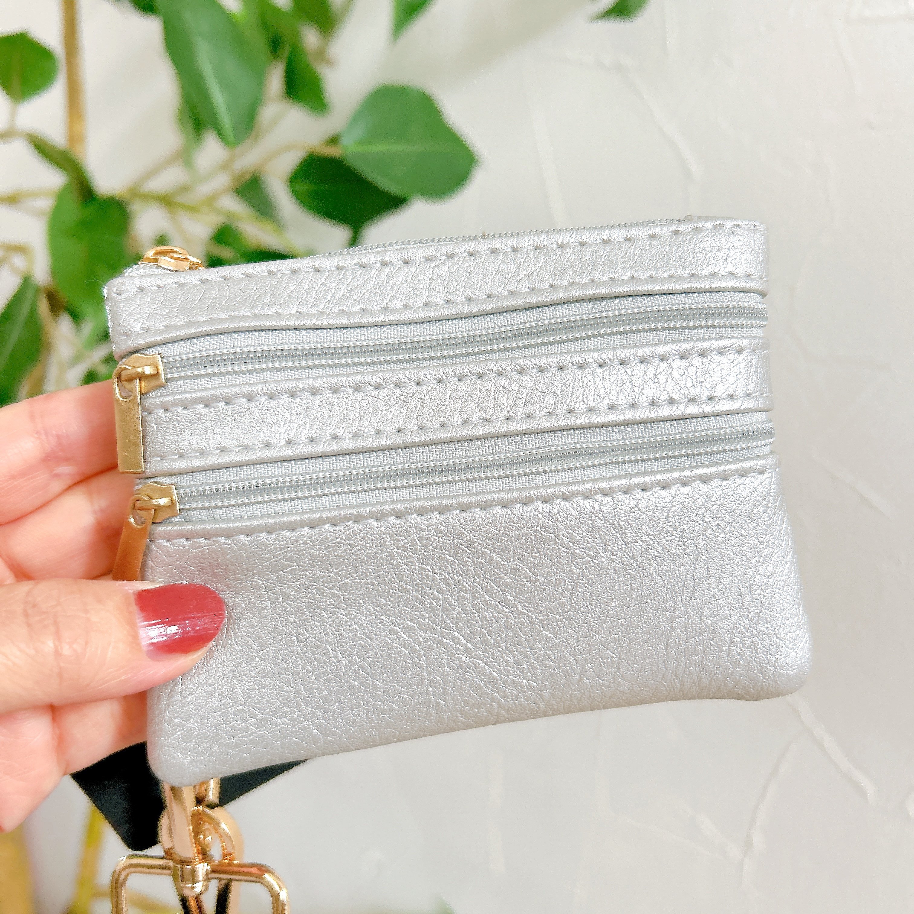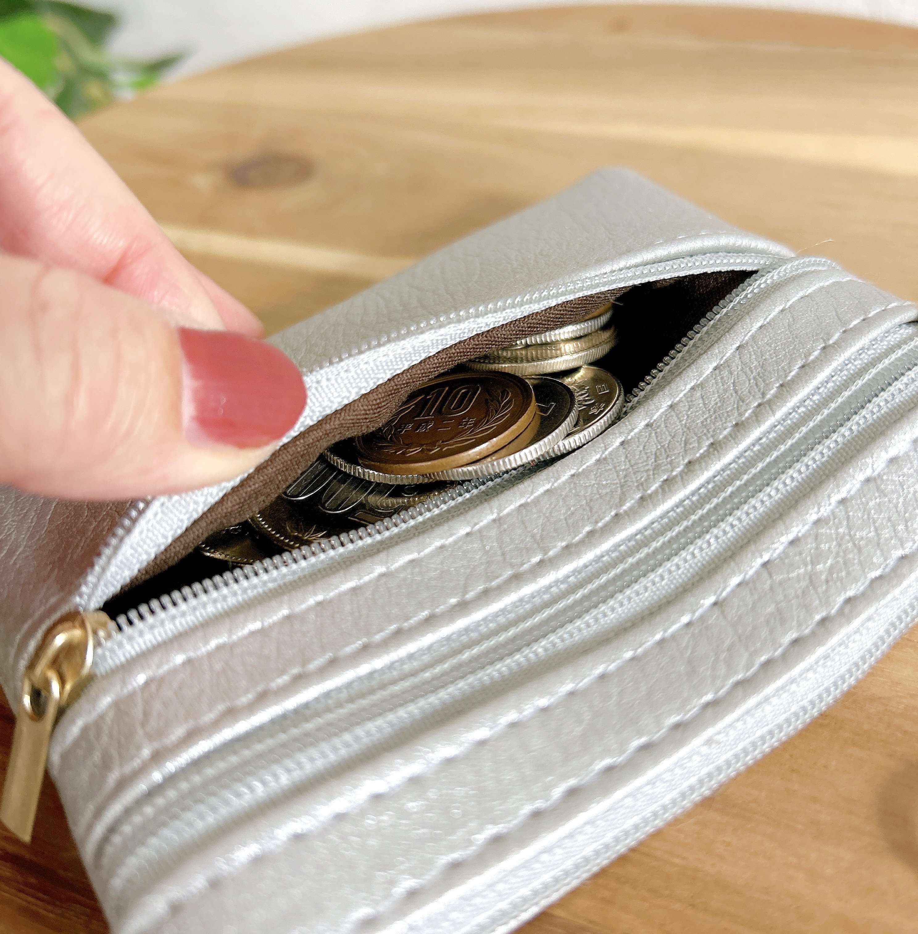 ミニポーチはシルバー色で、シボ感のあるフェイクレザーの素材がとっても高見え!ファスナー式のメインスペースと、表面に2段のファスナーポケットが付いていて、小物を分けて収納できるようになっています。