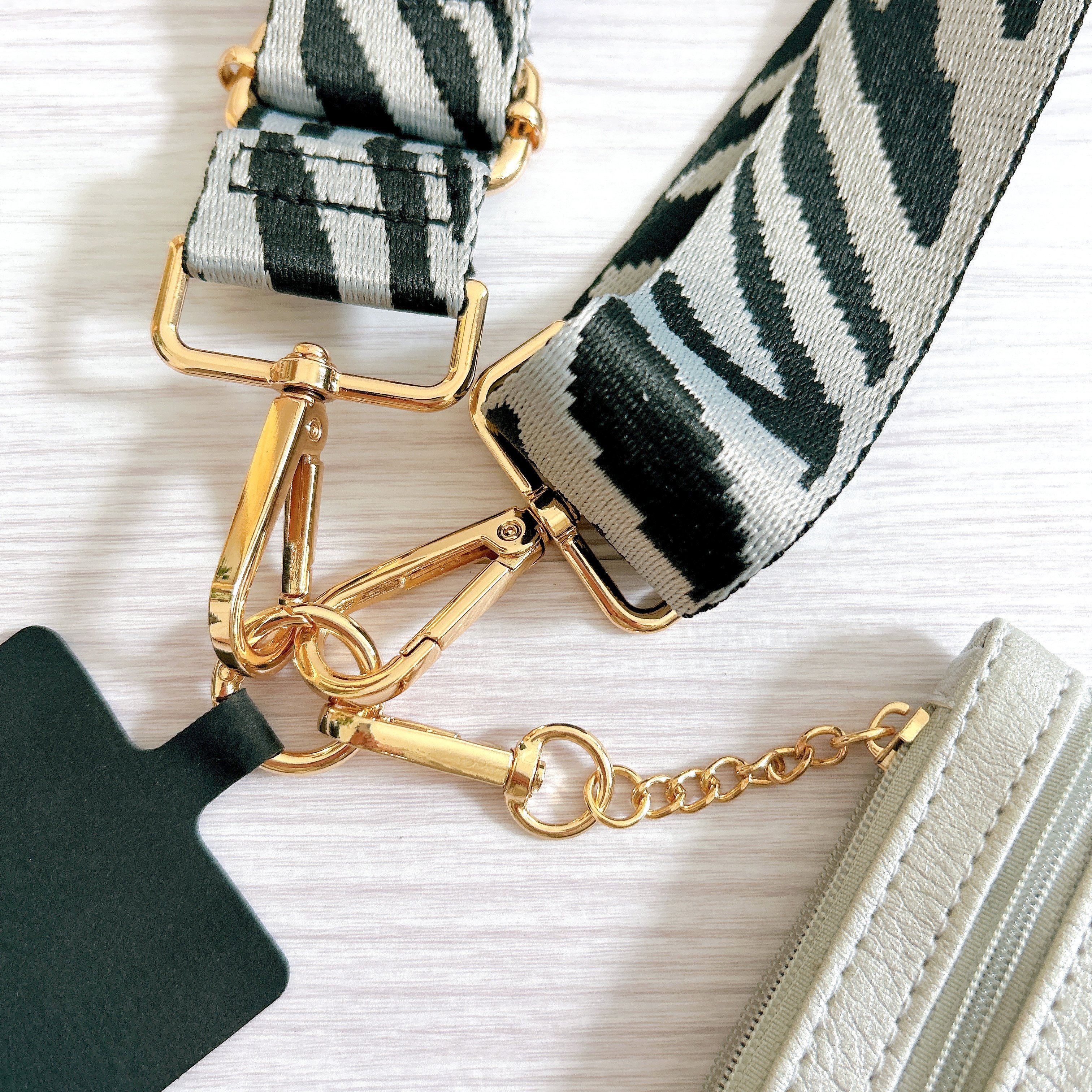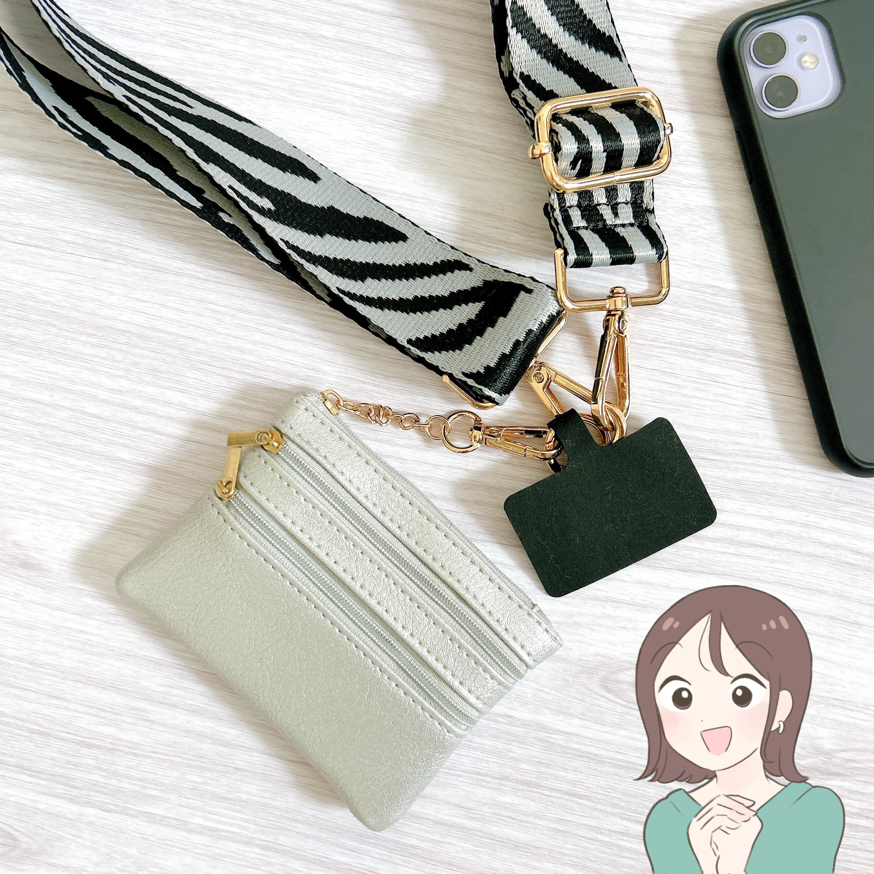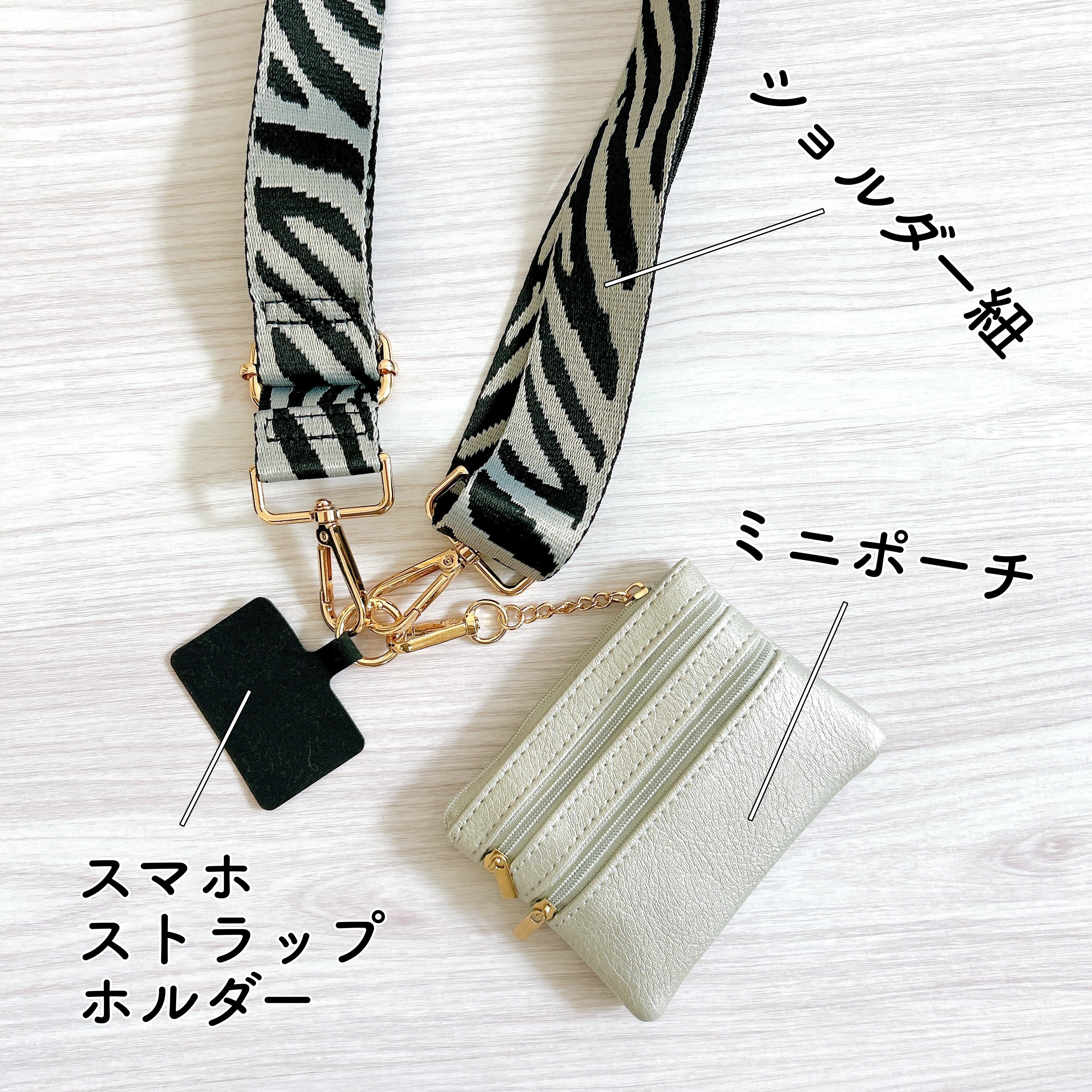 太めのショルダー紐に、ミニポーチとスマホのストラップホルダーが付いた3点セットのアイテムです。ショルダー紐の大胆なゼブラ柄が目を引くデザイン!