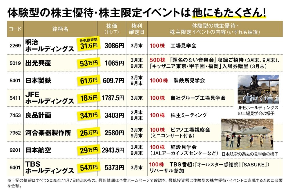 体験型の株主優待・株主限定イベントを提供する企業は他にもある。近年、株主持ち合いの解消を背景に、多くの企業が個人の“ファン株主”の獲得に力を入れており、その一環でもある。例えば、明治ホールディングス(2269)は全国各地の工場で見学会を実施。製造ラインを見学できる。日本航空(9201)は施設見学会を定期的に実施する。普段は社員しか立ち入れない施設を見ることができる貴重な機会。過去には航空機を間近で見られる格納庫見学会を実施したこともあった。ファン株主にはたまらない機会だ。
