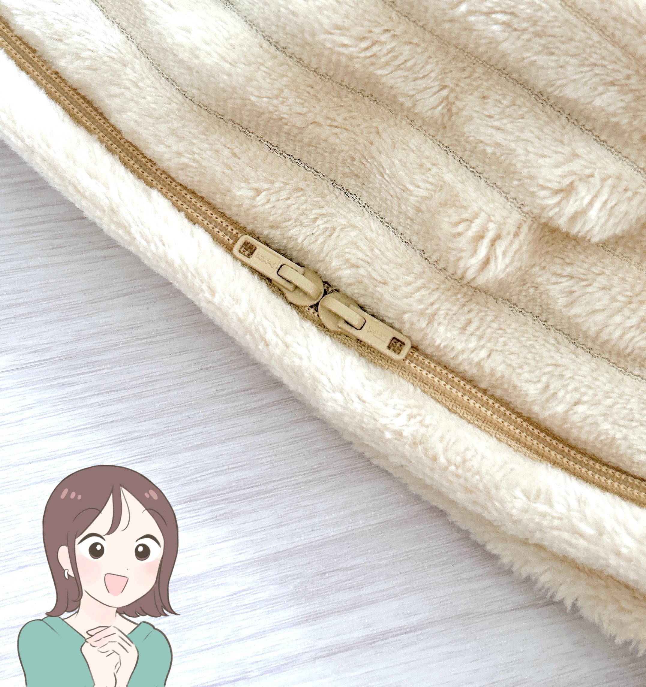 またダブルファスナー仕様になっているため、ファスナーを閉めるときに布団を巻き込みにくいし、両サイドからサッと閉じられて便利です。