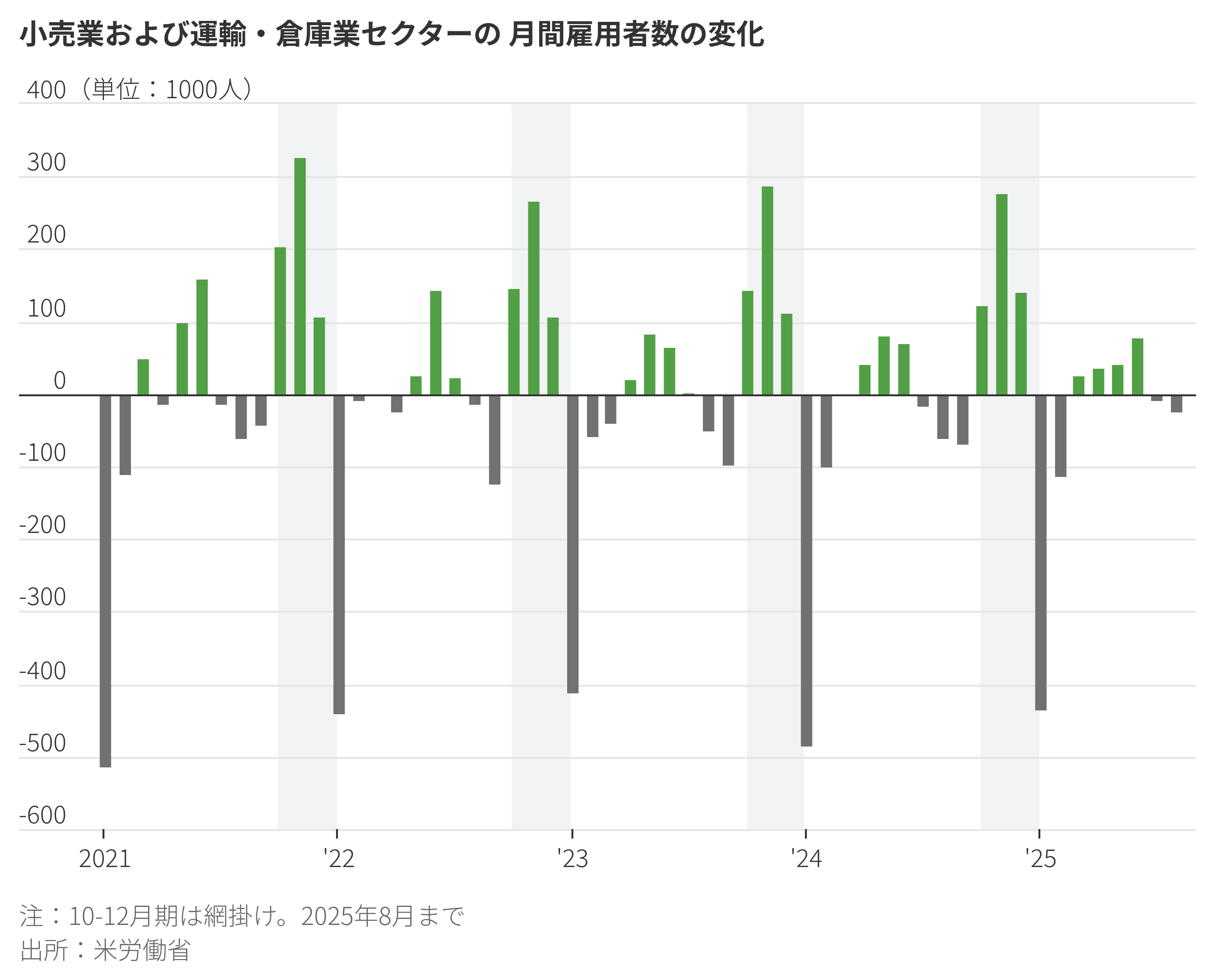 米国のホリデーシーズンでは毎年、数十万人が季節労働に従事している。だが今年はその仕事を見つけるのがより困難になっているとみられる。昨年のホリデーシーズンにフルタイムの仕事を失ったニューヨーク市クイーンズ地区出身のメレディス・カーボネルさん(37)は、小売り大手のコールズやターゲットなどの求職に応募しているものの、今のところ採用されず貯金が底をつきそうだと述べた。カーボネルさんは祖母の家で母親や15歳の息子と暮らしているが、「全くお金がなくなるのは避けたい。給料日までのぎりぎりの生活はしたくない」という。小売業や運輸・倉庫業は通常、ホリデーシーズンに向けて急いで人員を補充し、シーズン終了後に解雇する。労働省によれば昨年10-12月期には、これらの二つの業界で雇用者数が91万2000人増加した。その後、1~2月に85万8000人減った。