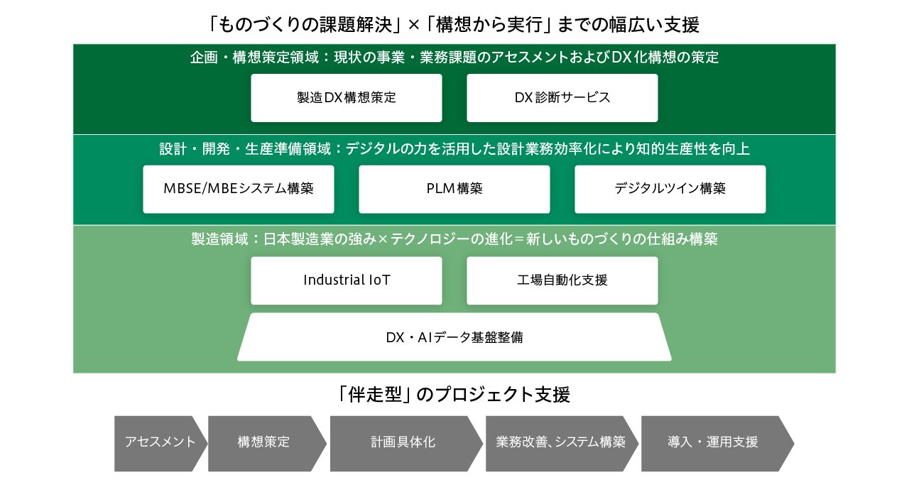 「ものづくりの全体、DX構想をサポートするのはコンサルティングチームです。中段の設計・開発・生産準備領域ではMBSE(Model Based Systems Engineering)/MBE(Model Based Enterprise)システム構築や、PLM(Product Lifecycle Management:製品ライフサイクル管理)構築、デジタルツイン構築などの幅広いソリューションを扱っています。製造領域では工場などのIoT活用や工場自動化(スマートファクトリー、AGV導入)を支援するケースが増えています。三つのレイヤー全てにおいて、AI活用は大きなテーマです」と清水氏は説明する。