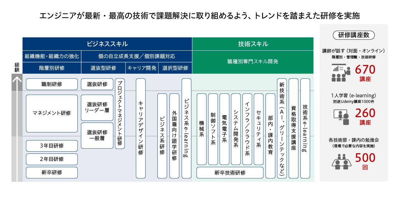 「当社の強みは幾つかあります。まず、エンジニアやコンサルタントなど、多様な人材の厚みです。エンジニアだけでも約1万人を擁しており、機械や電気、ITなど幅広い分野をカバーしています(図1)。また、当社は長く製造現場などへの派遣事業を展開しています。派遣事業を通じて運用のノウハウを培ってきました。そして、人材教育に非常に注力しています(図2)。ツールやシステムを導入するだけでなく、運用を含めたサポート力は当社の大きな強みです。加えて、お客さまと共に構想を描き、戦略を策定するコンサルティング能力を備えています」