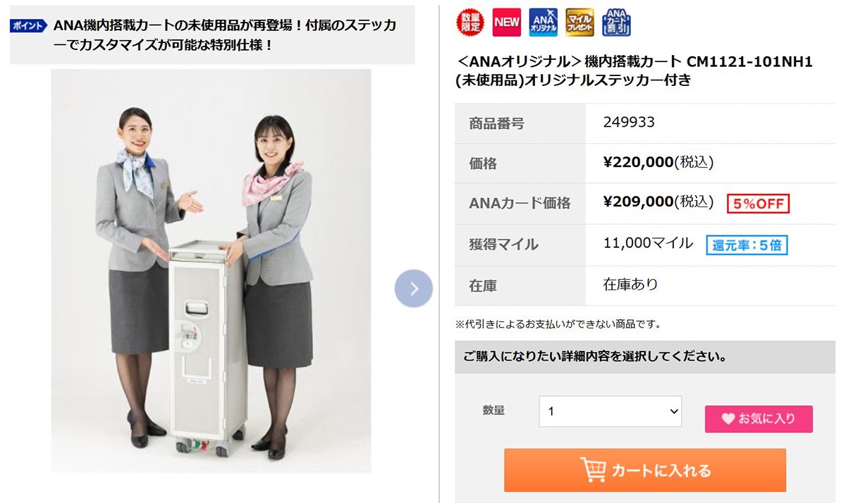 実は、機内食カートはANA公式ECサイトで販売している。新品が22万円で売られていることを考えると、6万円という価格は中古でも「お値打ち」と言えそうだ。何より、実際に使っていたという付加価値はプライスレスだろう。