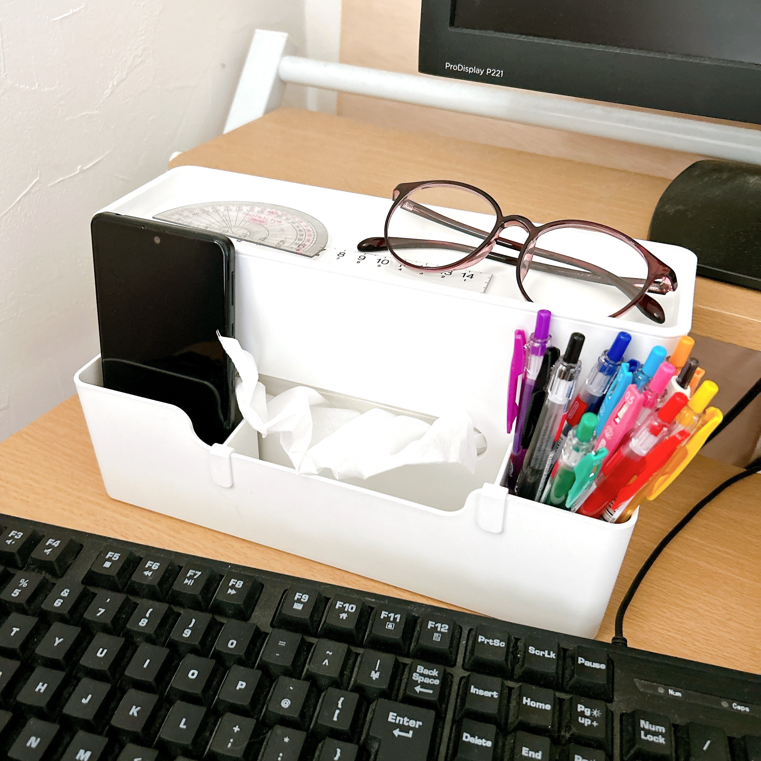 リビングだけでなく、仕事や勉強机の小物収納にも役立ってくれます。上部のトレーには文房具やメガネをサッと置けて便利です。