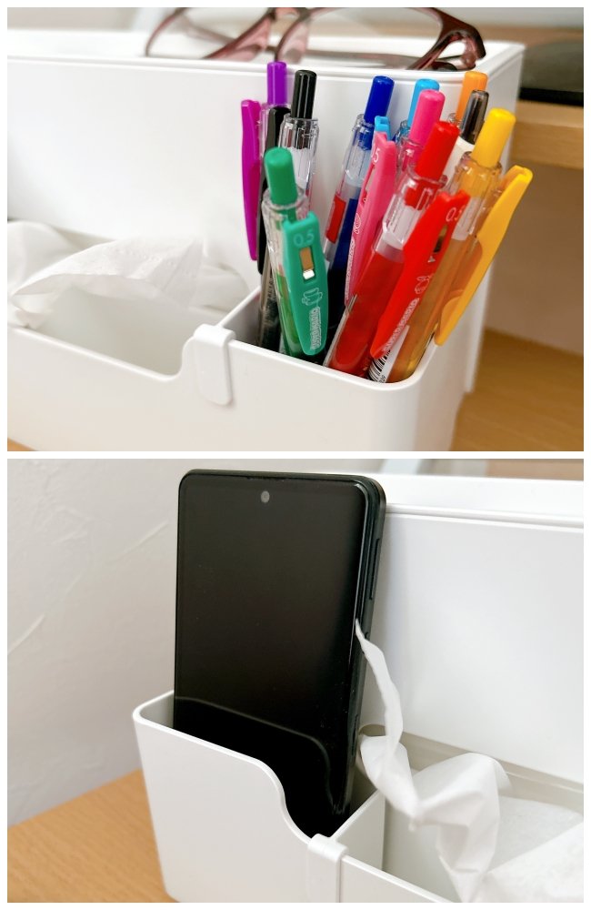 サイドにはペンが10本ほど入り、ペン立てとしても大活躍!さらに仕切りをずらして幅を広げれば、スマホも立てて置くことができました。
