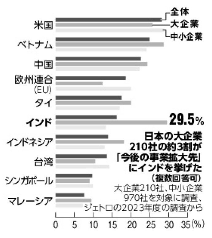 日系企業を対象とした2023年度のジェトロの調査で、今後の事業拡大先を問う質問に、大企業210社の3割が「インド」と答えた。米国やベトナムなどを上回る数値だ。