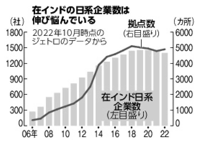 一方で、不動産のように投資が盛んな分野はあるものの、日本企業のインド進出は鈍化している。在インド日系企業数は、18年に1400社を超えてからは伸び悩む。